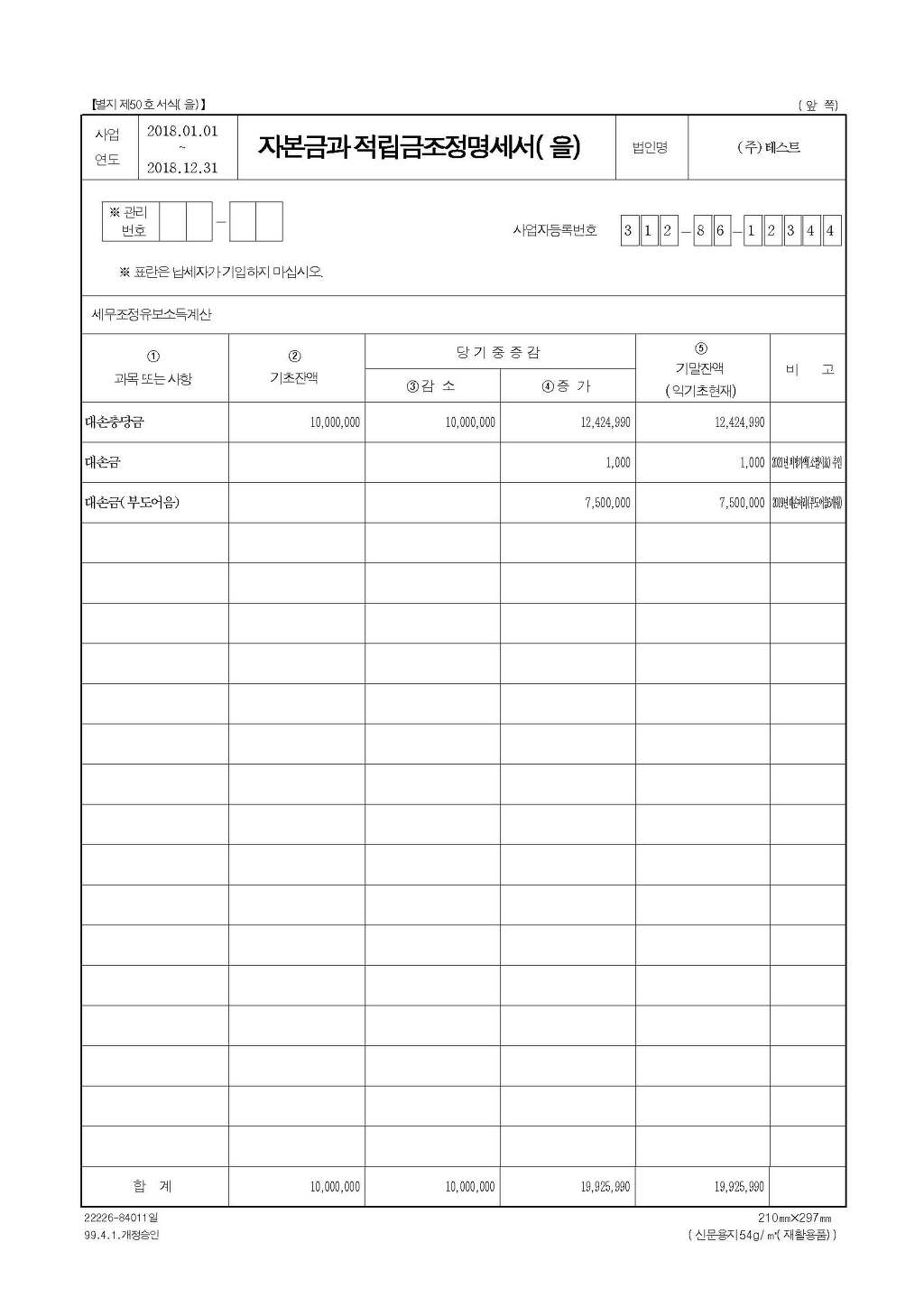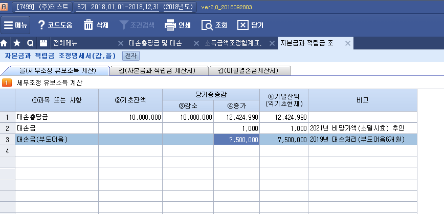 1. 전기 대손충당금부인누계액 (전기 자본금과 적립금(을)의 대손충당금 기말잔액)을 10. 대손충당금 부인누계액으로 와야 하며