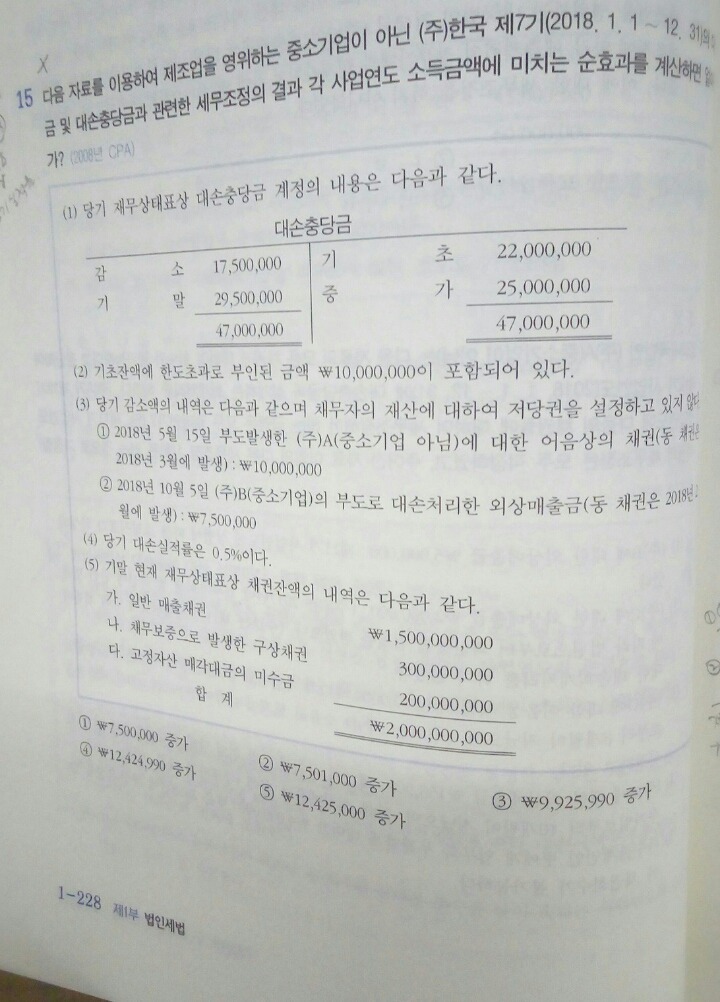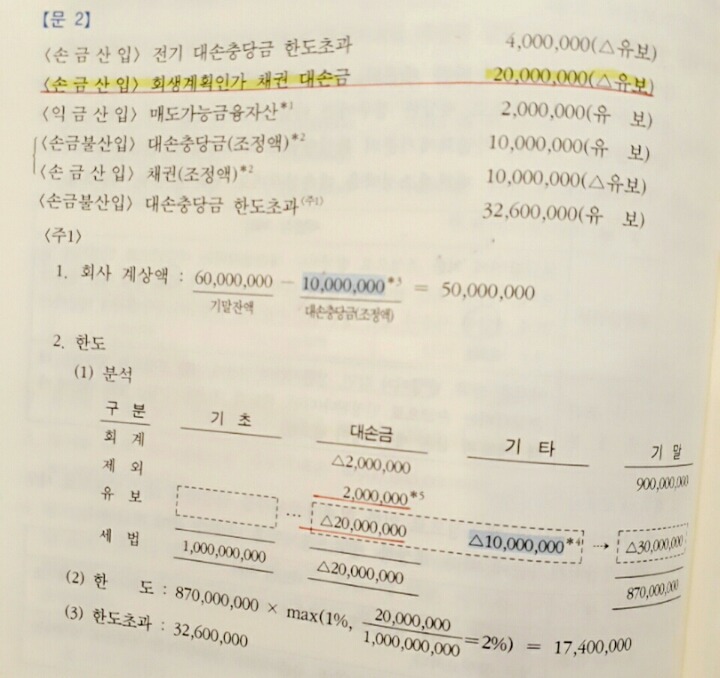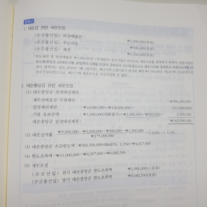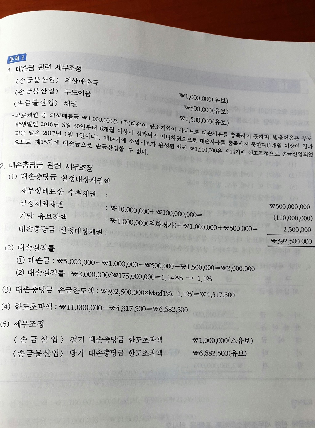 반드시 전기 대손충당금부인누계액은 전액을 손금산입(총액법,전기이월금액을 전부 환입)하고, 7.한도초과액(기말현재 대손충당금의 금액과 당기채권잔액의 1%와 비교)을 손금불산입한다.