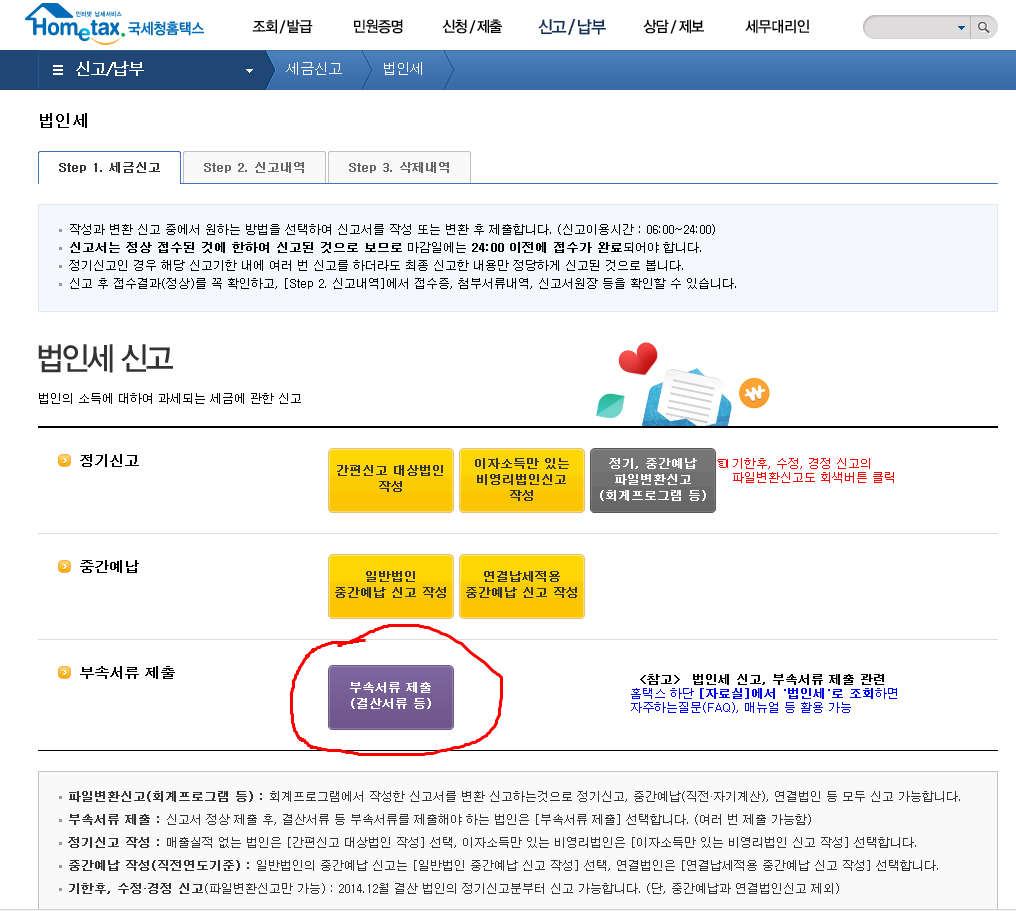 법인세를 전자신고하는 경우에도 국세청장이 고시하는 법인은 결산보고서 및 부속명세서(일반적으로 법인세 신고서류 일체)를 법인세 신고기한 종료후 10일이내에 제출.