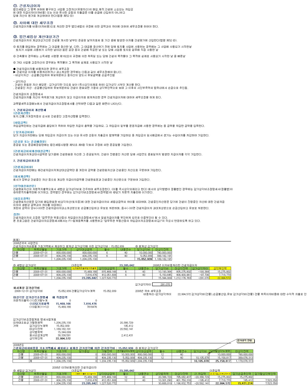 건설완료 이전 해의 (전기 건설자금이자 손금불산입 유보금액을 완료된 해의 고정자산등록에 17.전기말자본지출계에 입력) 감가상각비 추인될 경우 각 개별고정자산별로 내용을 보아 자본금과적립금 "을" 유보 쪽에서 건설자금이자 추인해야 함.