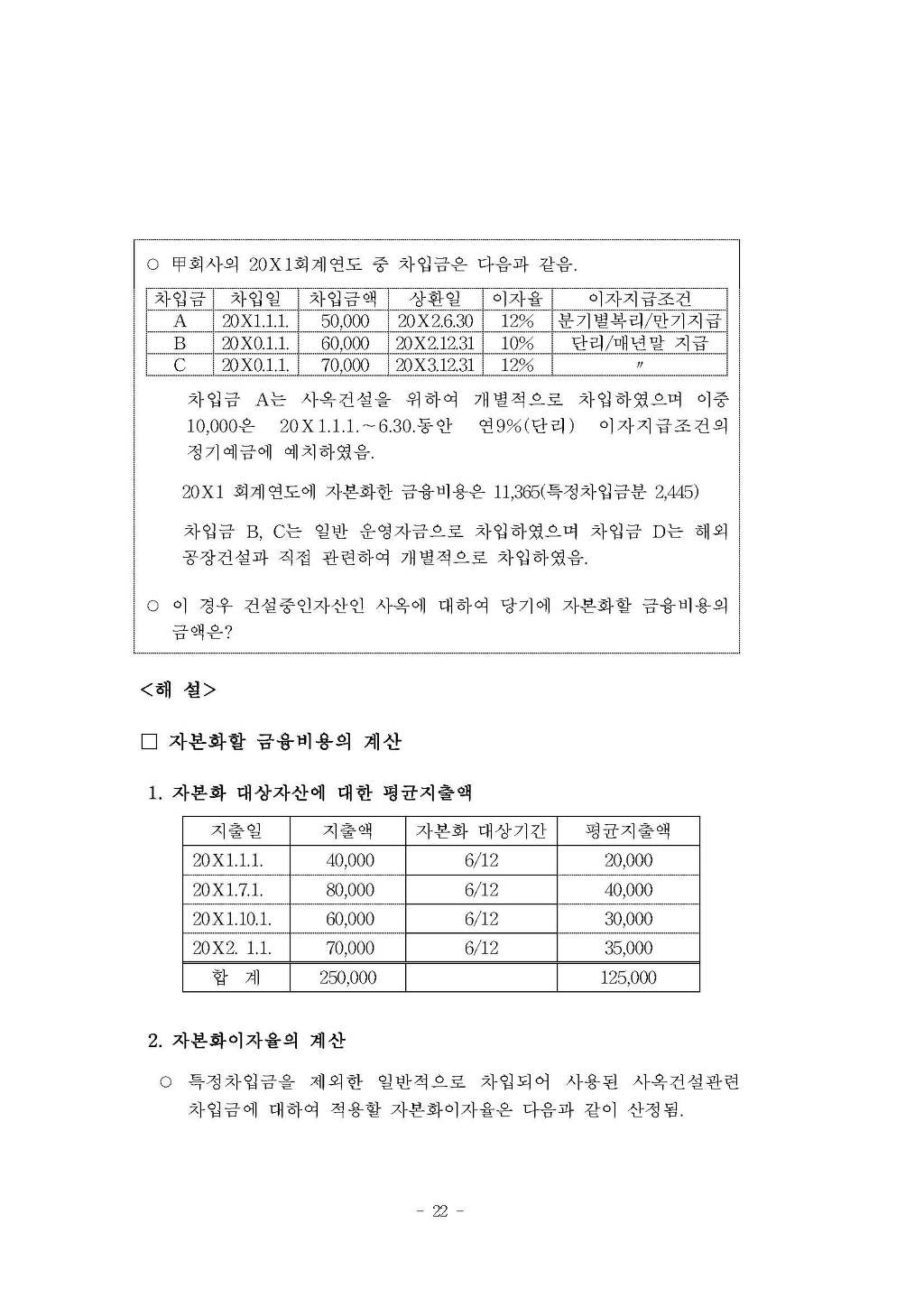 특정차입금 차입원가의 자본화계산 | 특정차입금 차입원가 – 특정차입금의 일시적 운용수익 | 특정차입금 지급이자 - 특정차입금의 일시예치이자 - 운영자금에 전용한 특정차입금 이자 + 특정차입금의 연체로 생긴 이자를 원본에 가산한 금액(가산된 연체자의 지급이자 제외) |