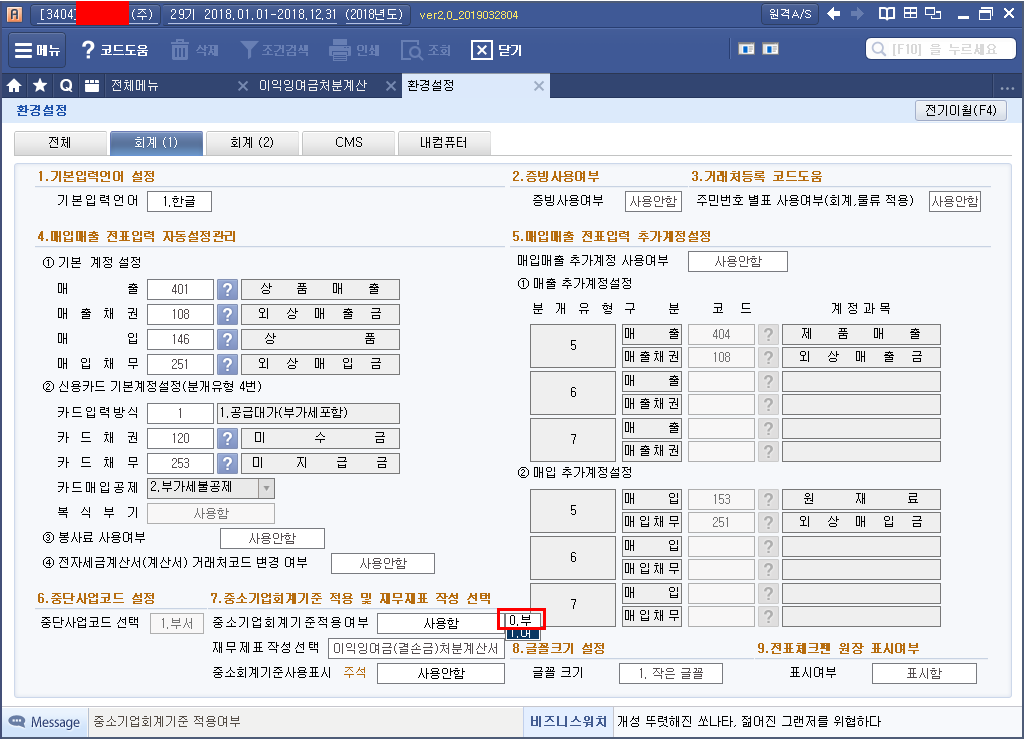 중소기업회계기준적용 여부 1.여 => 0.부 로 바꾼 다음 이익잉여금처분계산서 출력 의제사업연도 작성자Jayden Ju.|작성시간19.04.02|조회수307 목록 댓글 0 글자크기 작게가 글자크기 크게가 전기분손익계산서 회계기수 출력 오류 수정백업받거나 의제사업연도 다음검색 현재 게시글 추가 기능 열기 북마크 공유하기 신고 센터로 신고 댓글 댓글 0 댓글쓰기 답글쓰기 댓글 리스트