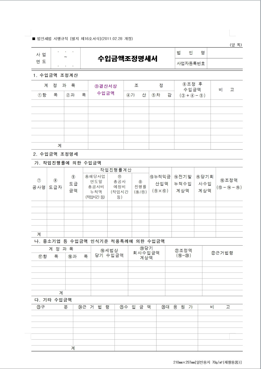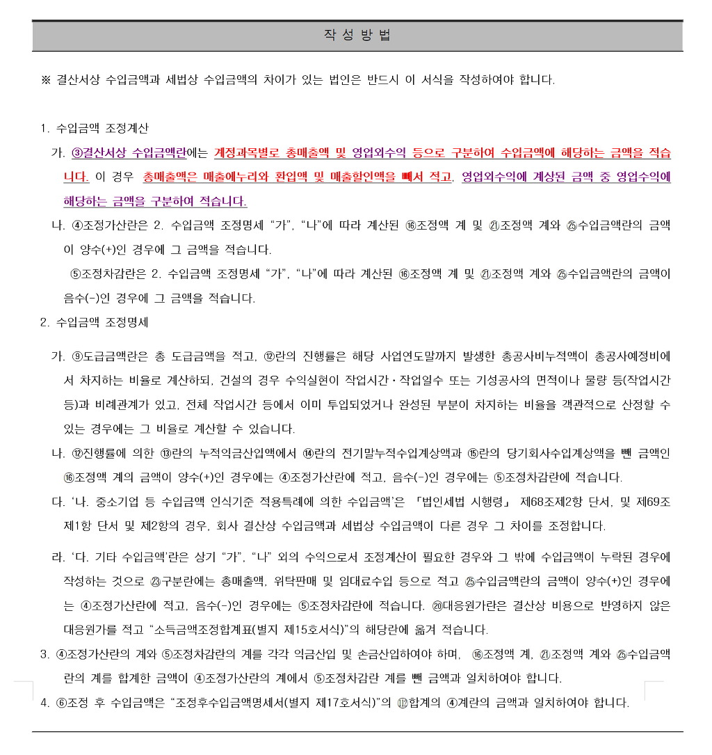 익금산입 및 손금 불산입 | 손금 산입 및 익금불산입 | 1. 유보(발생) | 1. 유보(발생) | 2. 유보(감소) | 2. 유보(감소) | 3. 배당 (※ 출자자(출자임원제외)) | 3. 기 타 | 4. 상여 (※ 사용인(임원포함)) | 잉여금 증감은 기타 | 5. 기타소득 (※ 전 각호이외의 개인) | | 6. 기타사외 유출(※법인 또는 사업을 영위하는 개인) | | 7. 기타 | | 잉여금 증감은 기타 | | 코드 | 소득금액조정내역 | 코드 | 소득금액조정내역 | 1 | 당기 법인세등 계상액 손금불산입하고 기타 사외유출로 처리함 | | | 2 | 소모품비중 당기말 현재 소모품 미사용분 손금불산입하고 유보로 처분함 | | | 3 | 전기 미사용 소모품에 대한 손금불산입액, 당기 사용완료되어 손금산입하고 유보처분함 | | | 5 | 작업진행율에 의한 기성고금액과 회사계상액과의 차액 조정분, 익금산입하고 유보처분함 | 4 | 작업진행율에 의한 기성고금액과 회사계상액과의 차액 조정분, 익금불산입하고 유보처분함 | | | 6 | 전기 공사기성고 차액 익금산입액의 당기 매출계상분에 대하여 익금불산입하고 유보처분함 | 7. | 장기 할부매출의 당기실현액에 대한 익금조정액,익금산입하고 유보처분함 | 8 | 장기할부매출의 당기 실현액에 대한 익금조정액, 익금불산입하고 유보처분함 | 11 | 장기할부매출의 익금불산입액에 대한 대응원가, 손금불산입하고 유보처분함 | 9 | 장기할부매출에 대한 전기 익금산입액의 당기 매출계상분에 대하여 익금불산입하고 유보처분함 | | | 10 | 장기할부매출의 익금산입액에 대한 대응원가, 손금산입하고 유보처분함 | 12 | 임대보증금에 대한 간주익금 상당액, 익금산입하고 기타 사외유출로 처분함 | | | 13 | 당기 회사계상 감가상각비중 상각부인액 손금불산입하고 유보처분함 | 14 | 감가상각비 기왕부인액중 손금추인액 손금산입하고 유보처분함 | 15 | 1995.1.1이후 취득 건축물등에 대한 감가상각비중 상각부인액 손금불산입하고 유보처분함 | | | 16 | 1995.1.1이후 취득 업종별 자산에 대한 감가상각비중 상각부인액 손금불산입하고 유보처분함 | | | 17 | 잔존가액 감가상각비중 상각부인액 손금불산입하고 유보처분함 | | | 18 | 퇴직급여 충당금 설정 한도초과액 손금불산입하고 유보처분함 | 19 | 퇴직급여 충당금 부인 누계액중 당기 퇴직금 지급으로 상계된 금액에 대하여 손금산입하고 유보처분함 | 21 | 임원에 대한 상여지급규정을 초과하여 지급한 상여금에 대해 손금불산입하고 당해 임원에 대한 상여로 처분함 | 20 | 퇴직급여 충당금 부인 누계액중 당기 환입한 금액에 대해 익금불산입하고 유보처분함 | 22 | 임원 퇴직금 한도초과액 손금불산입하고 당해 임원에 대한 상여로 처분함 | | | 23 | 당기 대손충당금 설정액중 한도초과액 손금불산입하고 유보처분함 | | | 24 | 당기 대손상각비중 부인액 손금불산입하고 유보처분함 | | | 25 | 대손충당금 과소환입액 익금산입하고 유보처분함 | 26 | 대손충당금 과다환입액 익금불산입하고 유보처분함 | 27 | 기밀비 한도초과액 손금불산입하고 대표자에 대한 상여로 처분함 | | | 28 | 접대비 한도초과액 손금불산입하고 기타 사외유출로 처분함 | | |