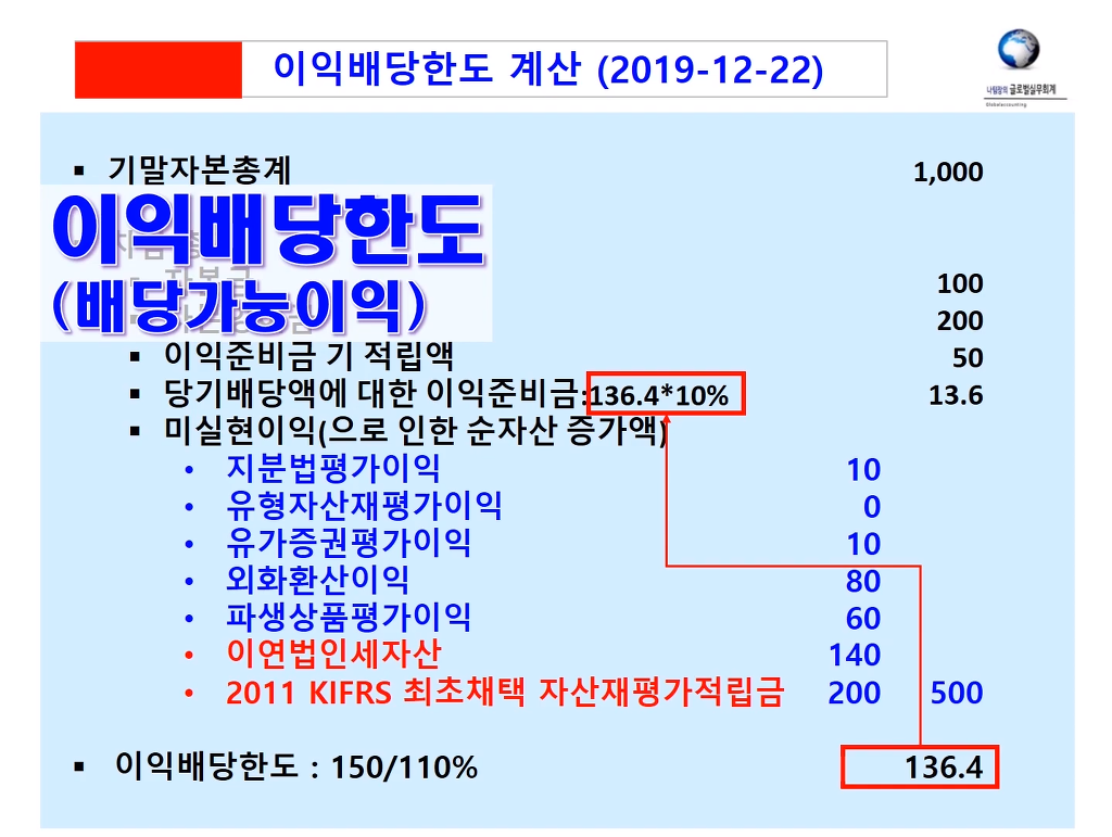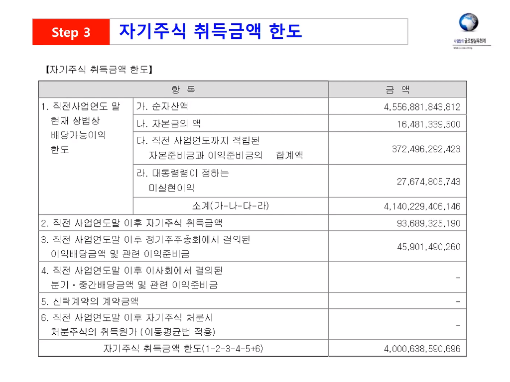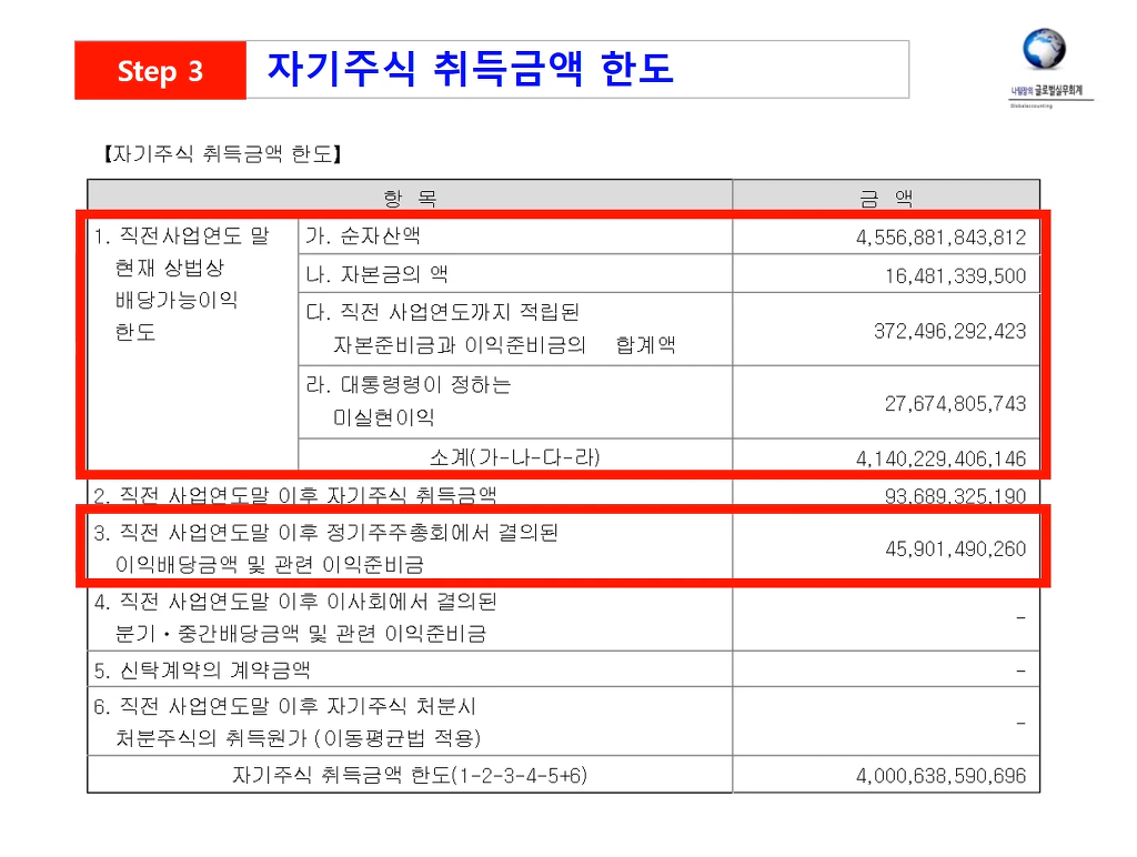 취득한도 | 당해 영업연도기준 상법상 배당가능이익
