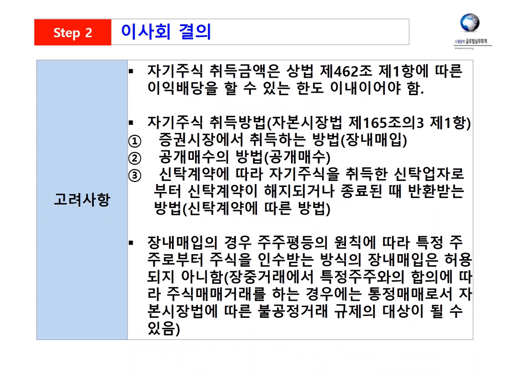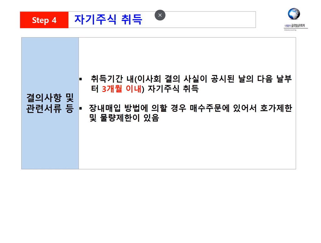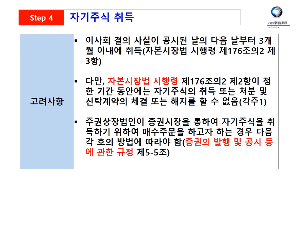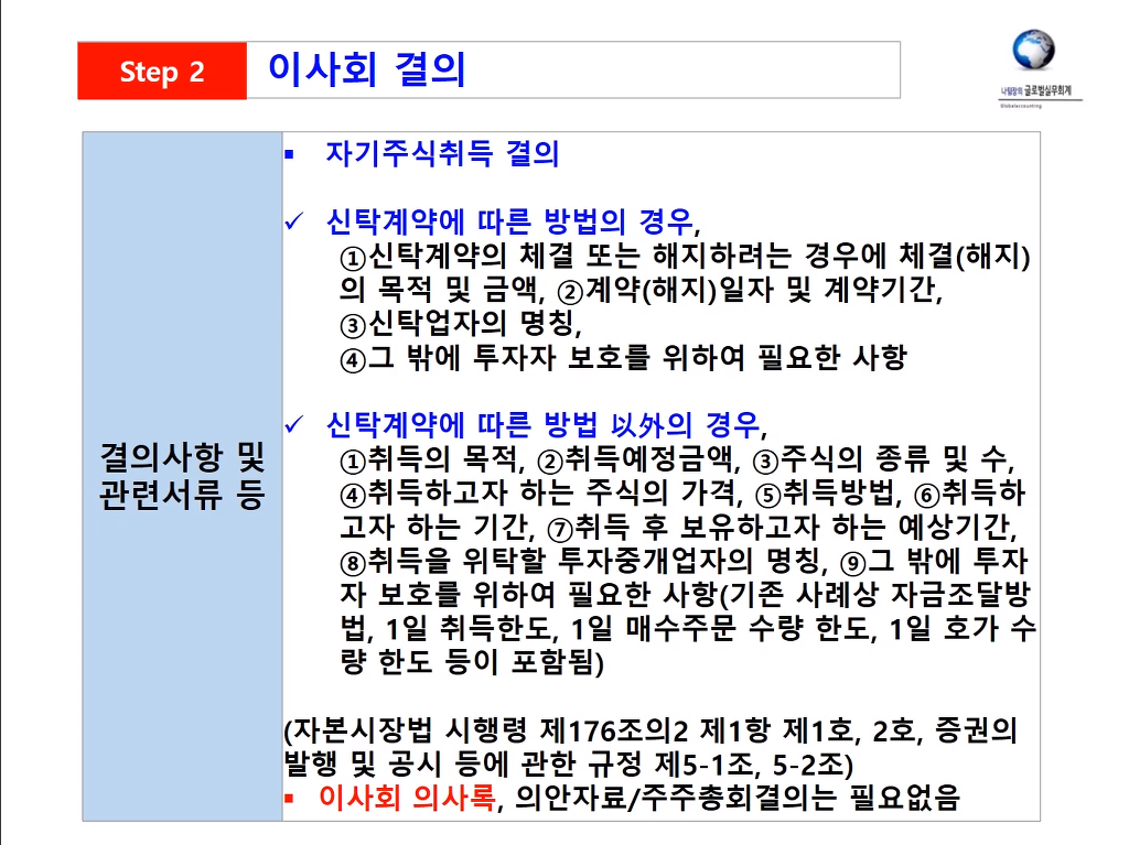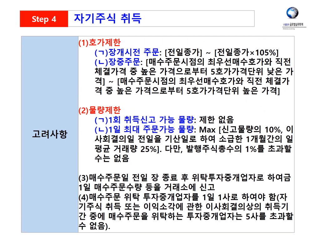 - 자기주식 취득(법 제189조의 2)시 적용되는 매수주문의 방법(매수주문가격, 일일매수주문수량 및 매수주문예정내용의 공시 등)이 이익소각을 위한 자기주식 취득시에도 동일하게 적용됨.