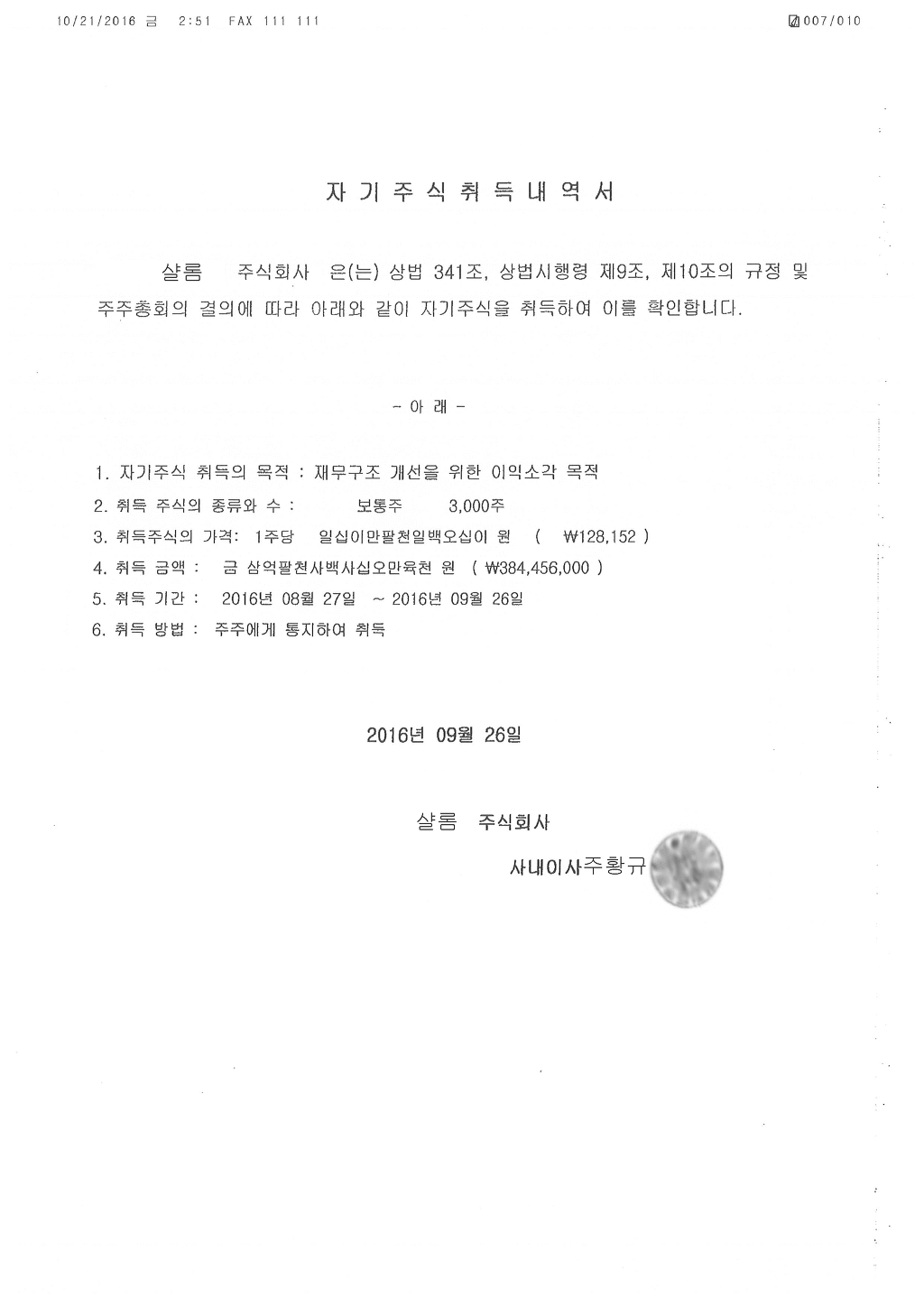회사가 배당이익으로 자사주 매입하여 취득경우나 법에서 허용하는 특정한 목적상 취득하는 경우를 제외하고 상법에서는 자기주식취득을 금지하고 있다. 허용되지 않음에도 취득한 경우에는 이를 무효로 하고 지급한 매매대금은 업무에 무관한 가지급금으로 보고 세금상 불이익을 줄 수 있기 때문에 전문가의 도움을 받아 진행하시길 권장해 드립니다.