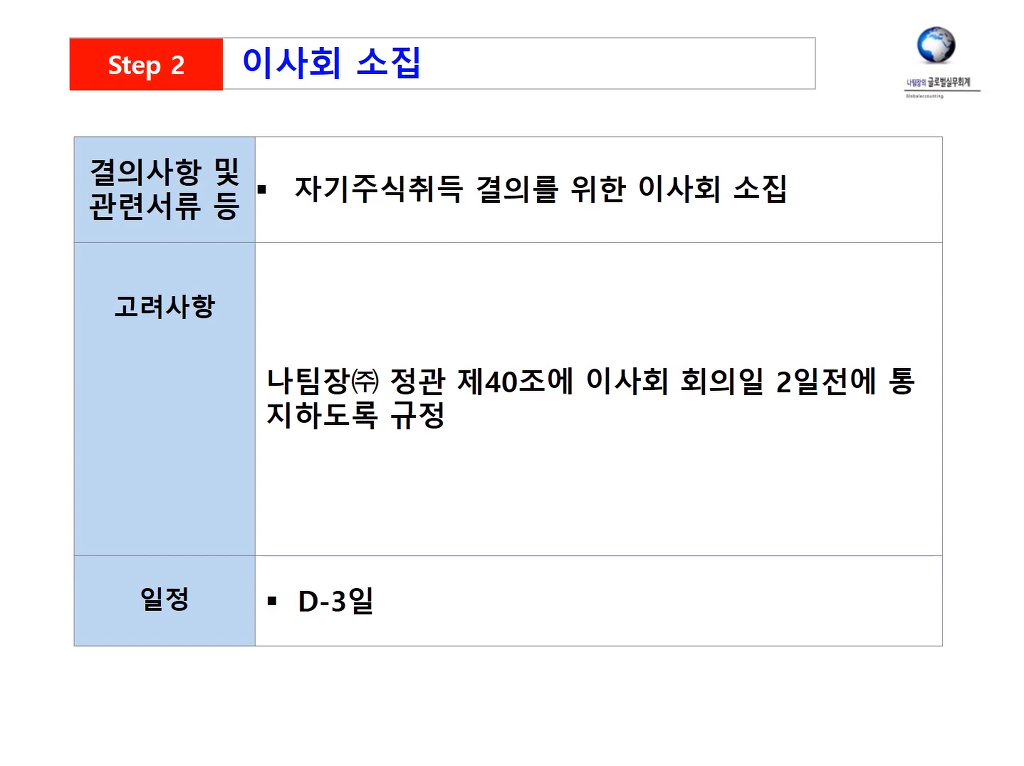 절차 | 정기주총 특별결의 | 이사회 결의 ㆍ정관에 이익소각 근거 필요 |