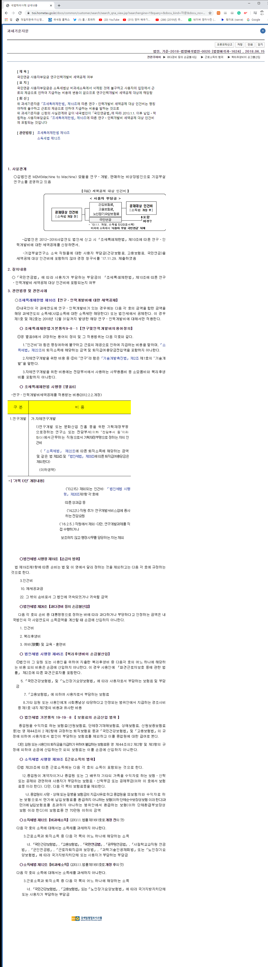 * [ ‘가목 1)단’ 개정내용] (’13.2.15.) 제외되는 인건비: 「법인세법 시행령」 제20조제1항 각 호에 따른 성과급 등 (’14.2.21.) 직원 추가: 연구개발서비스업에 종사하는 전담요원 (’16.2.5.) 직원에서 제외: 다만, 연구개발과제를 직접 수행하거나 보조하지 않고 행정사무를 담당하는 자는 제외 ○ 법인세법 시행령 제19조【손금의 범위】 법 제19조제1항에 따른 손비는 법 및 이 영에서 달리 정하는 것을 제외하고는 다음 각 호에 규정하는 것으로 한다. 3.인건비 10. 제세공과금 22. 그 밖의 손비로서 그 법인에 귀속되었거나 귀속될 금액 ○ 법인세법 제26조【과다경비 등의 손금불산입】 다음 각 호의 손비 중 대통령령으로 정하는 바에 따라 과다하거나 부당하다고 인정하는 금액은 내국법인의 각 사업연도의 소득금액을 계산할 때 손금에 산입하지 아니한다. 1. 인건비 2. 복리후생비 3. 여비(旅費) 및 교육ㆍ훈련비 ○ 법인세법 시행령 제45조【복리후생비의 손금불산입】 ① 법인이 그 임원 또는 사용인을 위하여 지출한 복리후생비 중 다음 각 호의 어느 하나에 해당하는 비용 외의 비용은 손금에 산입하지 아니한다. 이 경우 사용인에 「파견근로자보호 등에 관한 법률」 제2조에 따른 파견근로자를 포함한다. 5.「국민건강보험법」및「노인장기요양보험법」에 따라 사용자로서 부담하는 보험료 및 부담금 7.「고용보험법」에 의하여 사용자로서 부담하는 보험료 8.기타 임원 또는 사용인에게 사회통념상 타당하다고 인정되는 범위안에서 지급하는 경조사비 등 제1호 내지 제7호의 비용과 유사한 비용 ○ 법인세법 기본통칙 19-19…8 【 보험료의 손금산입 범위 】 종업원을 수익자로 하는 보험료(선원보험료, 단체정기재해보험료, 상해보험료, 신원보증보험료 등)는 영 제44조의 2 제2항에 규정하는 퇴직보험료 등과「국민건강보험법」및「고용보험법」의 규정에 의하여 사용자로서 법인이 부담하는 보험료를 제외하고 이를 종업원에 대한 급여로 본다. 다만, 임원 또는 사용인의 퇴직금을 지급하기 위하여 불입하는 보험료 중 영 제44조의2 제2항 및 제3항의 규정에 의하여 손금에 산입하는 것 외의 보험료는 이를 손금에 산입하지 아니한다. ○ 소득세법 시행령 제38조【근로소득의 범위】 ① 법 제20조에 따른 근로소득에는 다음 각 호의 소득이 포함되는 것으로 한다. 12.종업원이 계약자이거나 종업원 또는 그 배우자 기타의 가족을 수익자로 하는 보험ㆍ신탁 또는 공제와 관련하여 사용자가 부담하는 보험료ㆍ신탁부금 또는 공제부금(이하 이 호에서 "보험료등"이라 한다). 다만, 다음 각 목의 보험료등을 제외한다. 나. 종업원의 사망ㆍ상해 또는 질병을 보험금의 지급사유로 하고 종업원을 피보험자와 수익자로 하는 보험으로서 만기에 납입보험료를 환급하지 아니하는 보험(이하 "단체순수보장성보험"이라 한다)과 만기에 납입보험료를 초과하지 아니하는 범위안에서 환급하는 보험(이하 "단체환급부보장성보험"이라 한다)의 보험료중 연 70만원 이하의 금액 ○ 소득세법 제12조【비과세소득】(2013.1.1. 법률 제11611호로 개정 전의 것) 다음 각 호의 소득에 대해서는 소득세를 과세하지 아니한다. 3.근로소득과 퇴직소득 중 다음 각 목의 어느 하나에 해당하는 소득 너.「국민건강보험법」,「고용보험법」,「국민연금법」,「공무원연금법」,「사립학교교직원 연금법」,「군인연금법」,「근로자퇴직급여 보장법」,「과학기술인공제회법」또는「노인장기요양보험법」에 따라 국가ㆍ지방자치단체 또는 사용자가 부담하는 부담금 ○ 소득세법 제12조【비과세소득】(2013.1.1. 법률 제11611호로 개정 후의 것) 다음 각 호의 소득에 대해서는 소득세를 과세하지 아니한다. 3.근로소득과 퇴직소득 중 다음 각 목의 어느 하나에 해당하는 소득 너.「국민건강보험법」,「고용보험법」또는「노인장기요양보험법」에 따라 국가ㆍ지방자치단체 또는 사용자가 부담하는 부담금 |