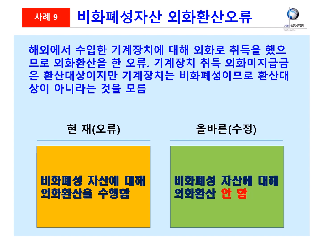 | 비화폐성 외화자산과 부채 | 재고자산, 선급금, 선수금, 투자자산, 유형자산 등 | 외화환산에 대한 평가를 하지 않음 |
