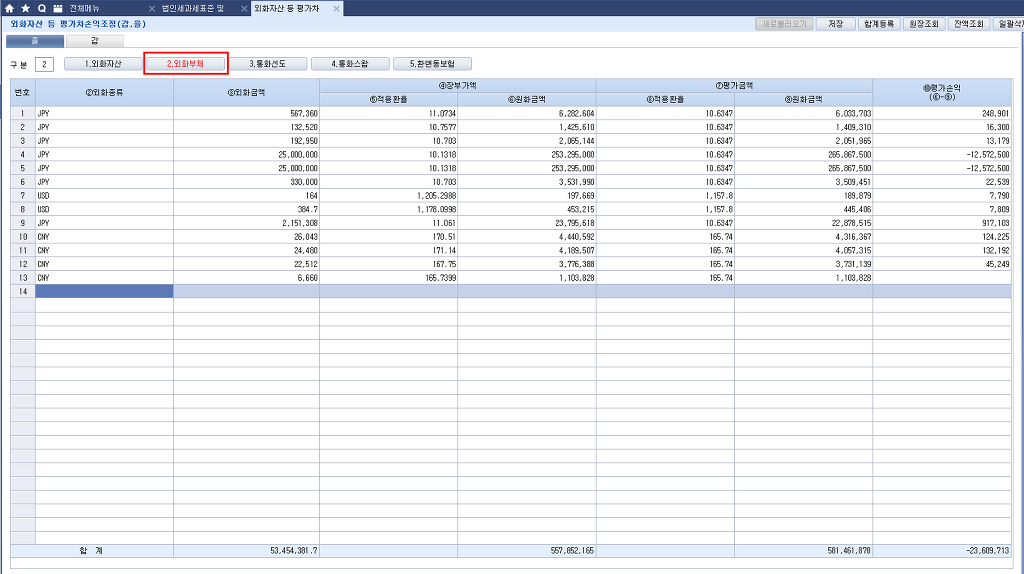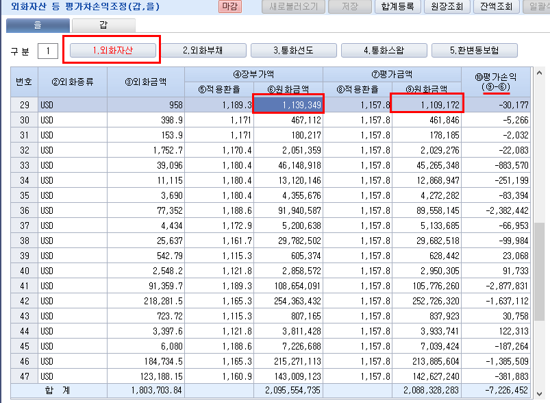 외화평가차손익조정명세서의 "⑩평가차손익조정금액"란의 금액즉 외화 기초가액에서 기말가액을 차감한 가액이 양수(평가감)인 경우 외화자산은 총수입금액산입, 외화부채는 필요경비산입하고,