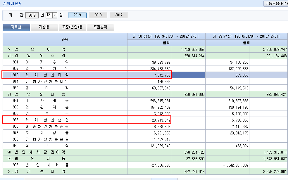 ① 양수값은 =sumif(범위,">0") => 외화환산이익 [910] 영업외수익