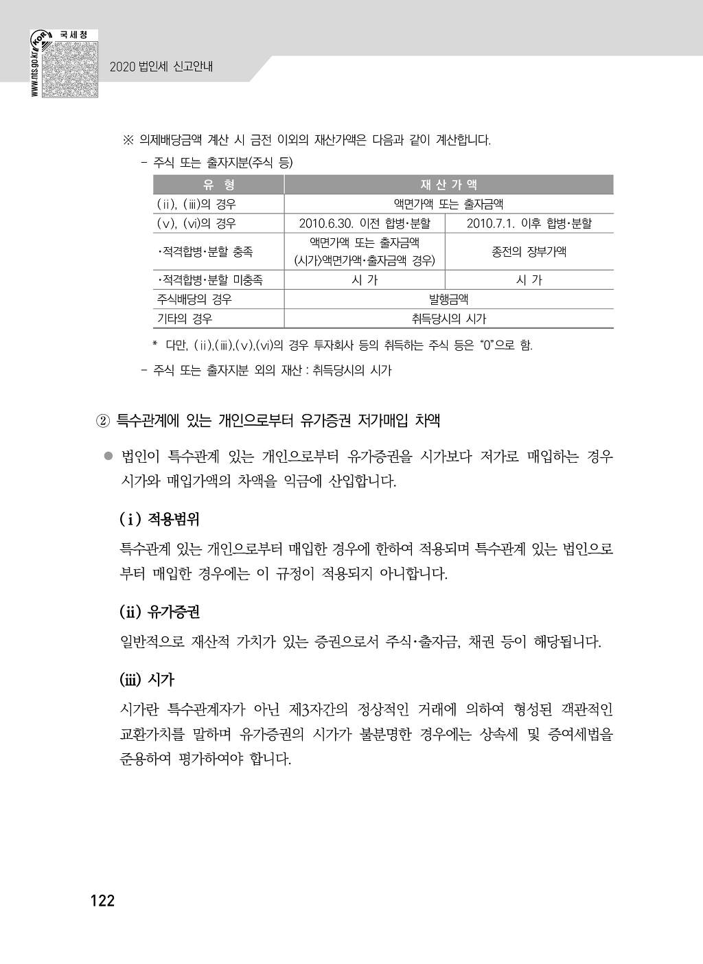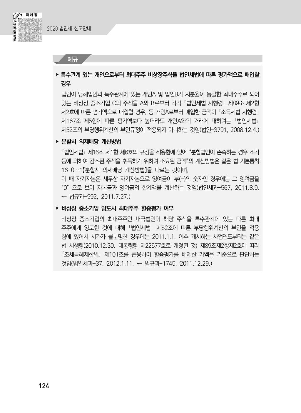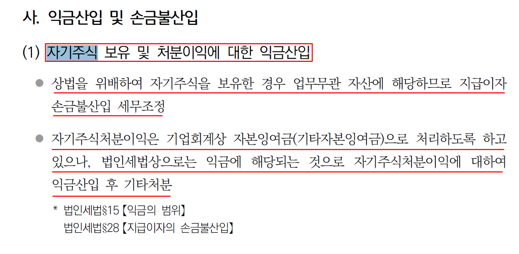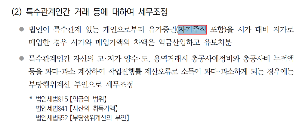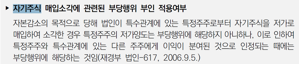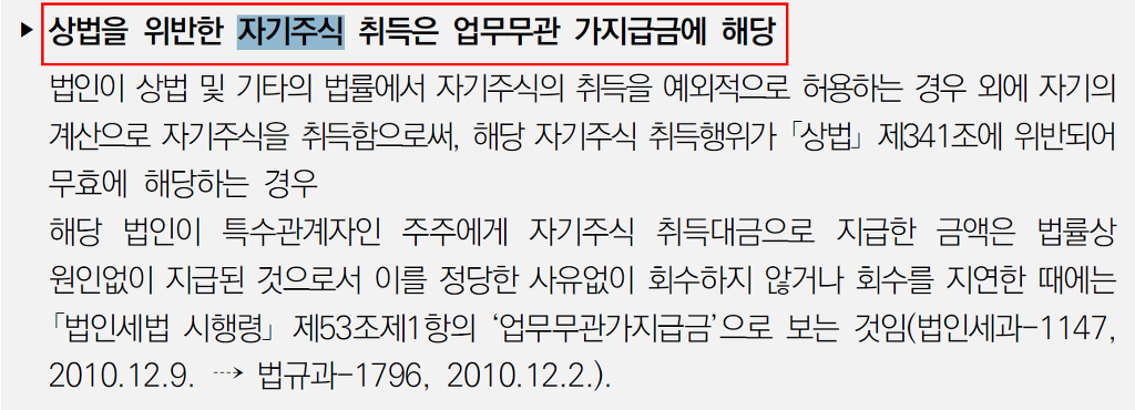 | 법인-1148, 2010.12.9. | 법인이 상법 및 기타의 법률에서 자기주식의 취득을 예외적으로 허용하는 경우 외에 자기의 계산으로 자기주식을 취득함으로써, 해당 자기주식 취득행위가 「상법」 제341조에 위반되어 무효에 해당하는 경우 해당 법인이 특수관계자인 주주에게 자기주식 취득대금으로 지급한 금액은 법률상 원인 없이 지급된 것으로서 이를 정당한 사유 없이 회수하지 않거나 회수를 지연한 때에는 「법인세법 시행령」 제53조 제1항의 ‘업무 무관 가지급금’으로 본다. |