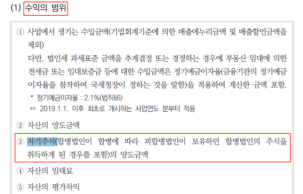 | 조세심판례 (조심 2013중788, 2013.6.25.) | 회사가 자기주식을 취득할 수 있는 예외적인 경우로 인정하기는 곤란하다고 할 것이므로 처분청이 쟁점금액을 업무무관 가지급금으로 보아 이에 대한 인정이자를 계산하여 익금에 산입한 후 과세한 이 건 법인세 처분은 달리 잘못이 없다고 판단된다. |