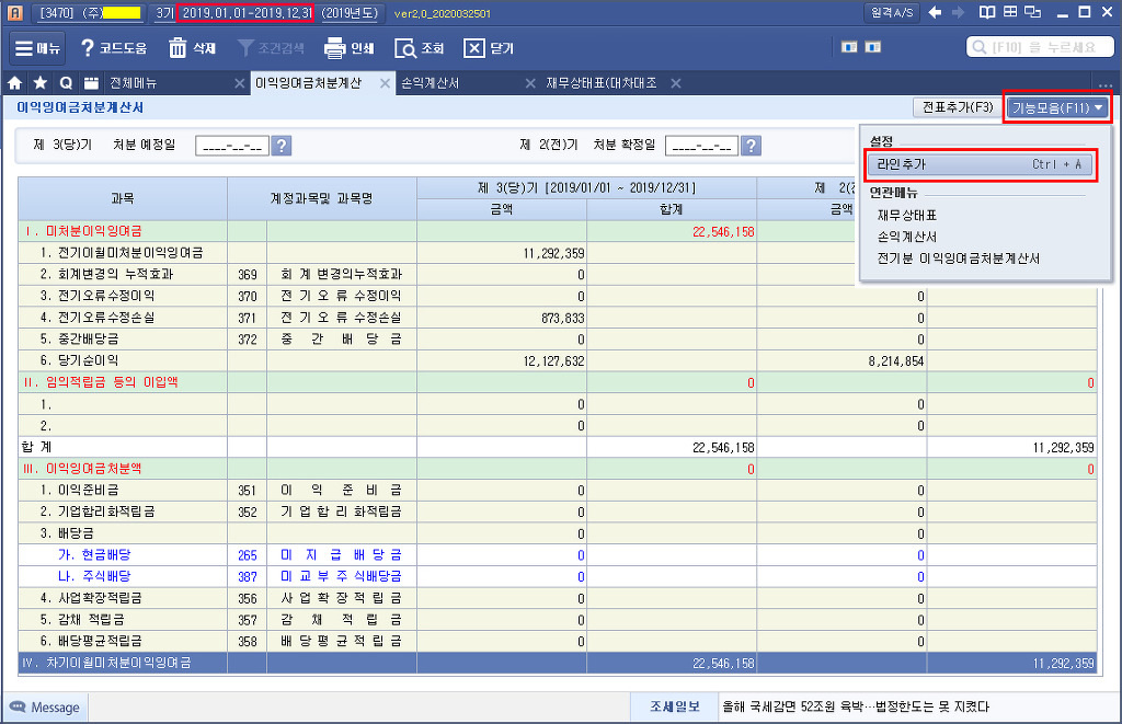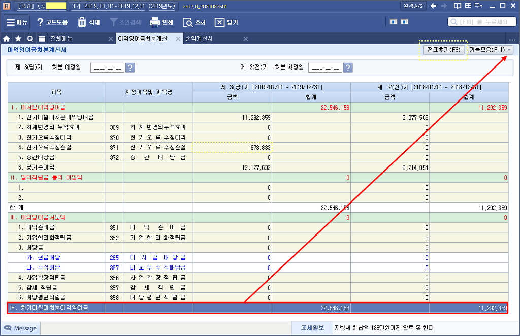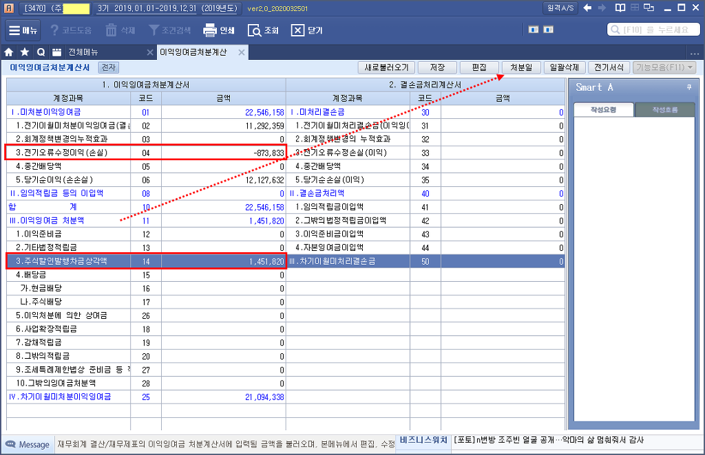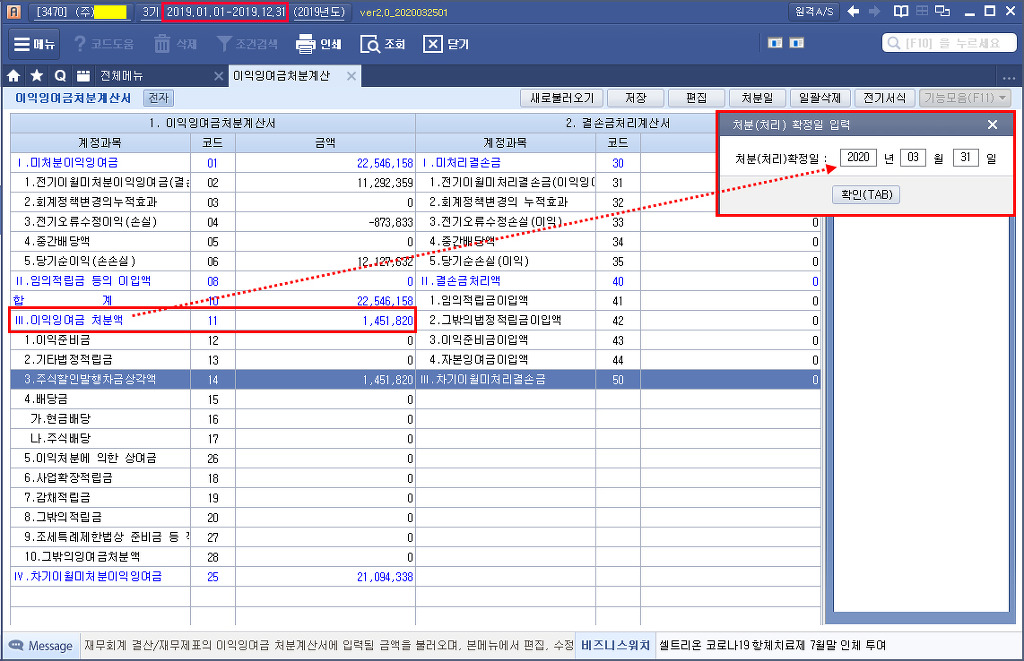 하단 표준이익잉여금 처분계산서상의 불러오기 했을때 표시