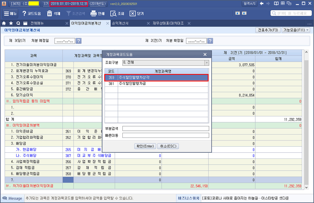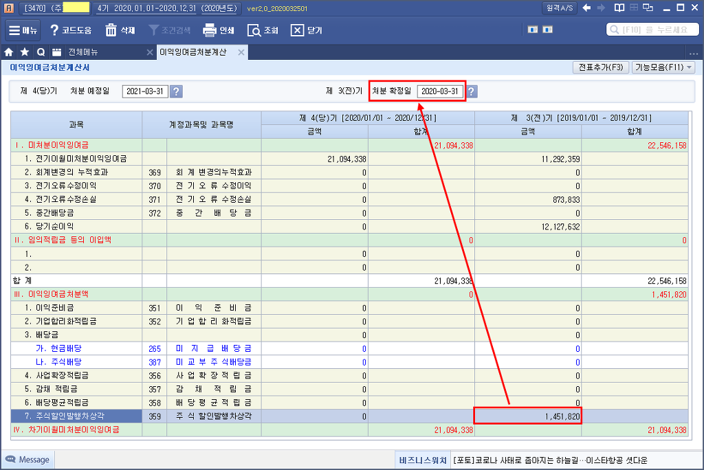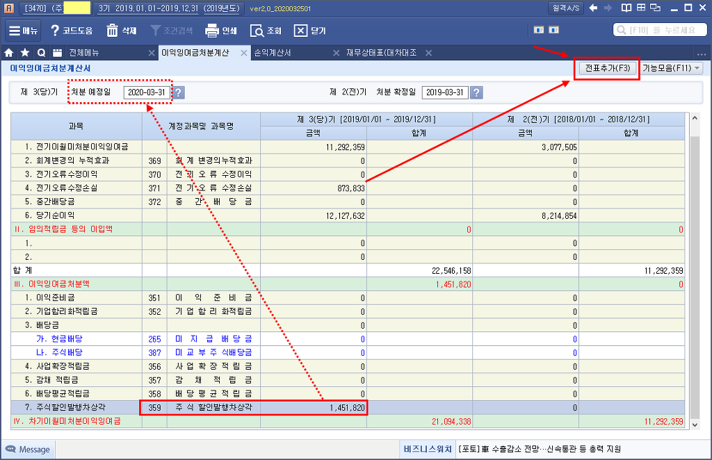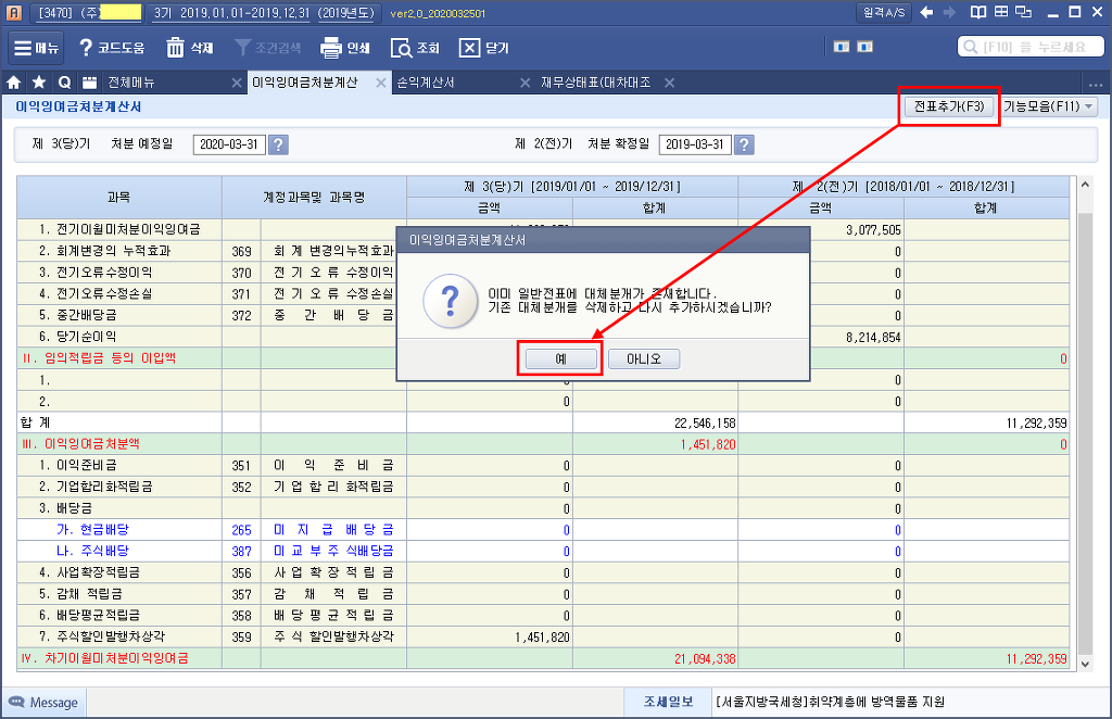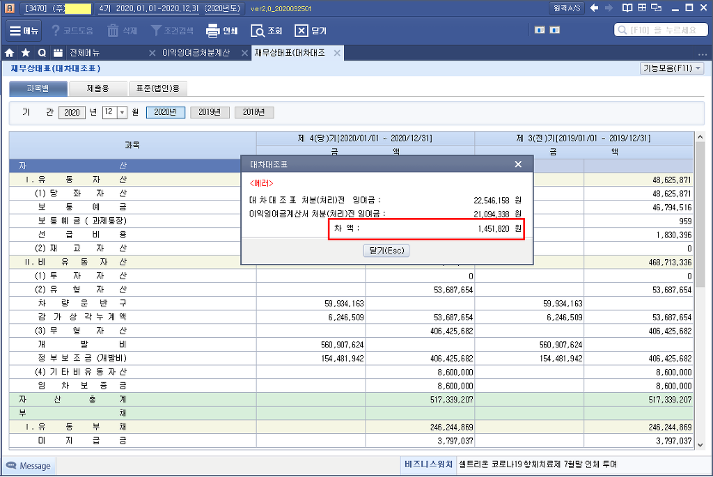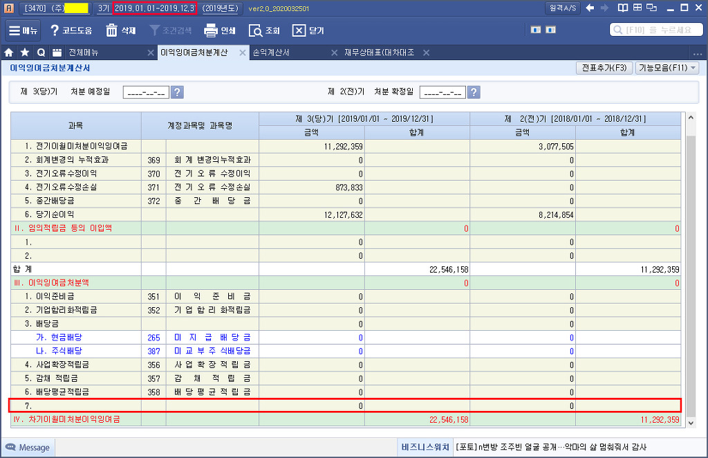상기 계정은 미처분이익잉여금을 손익대체분개로 증감시켜야 하기 때문에 반드시 이익잉여금처분계산서의 전표추가(F3)을 눌러야 합니다. 그래야 재무상태표(대차대조표)에서 대차차액이 안 뜹니다.
