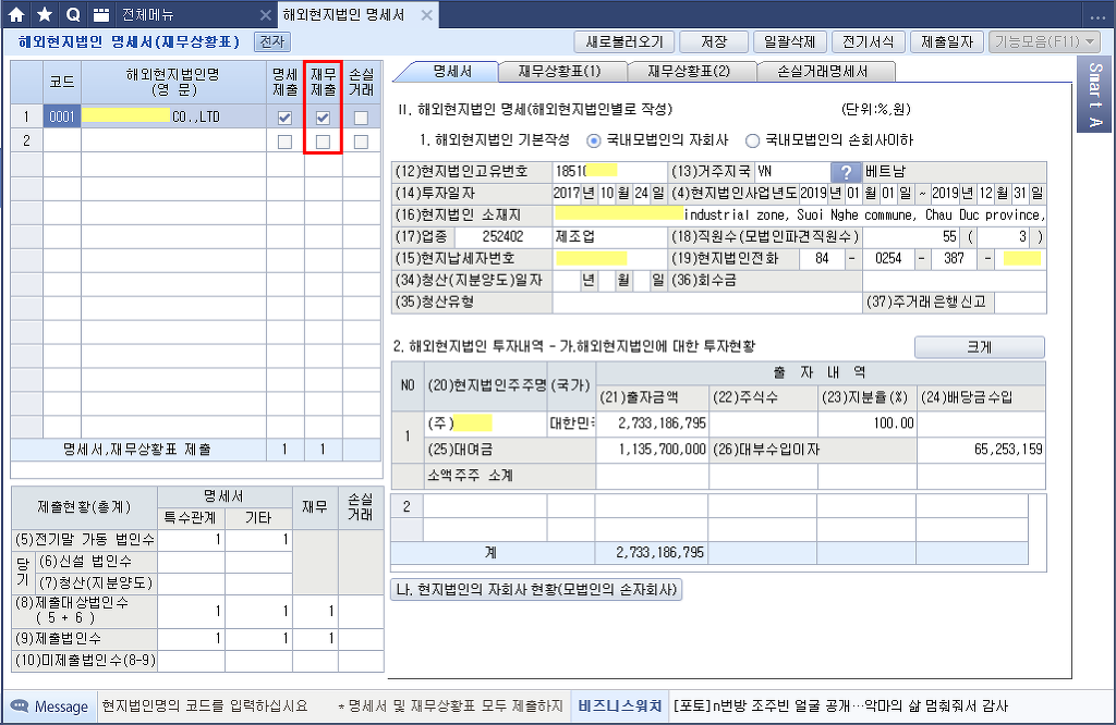 2. 해외현지법인의 해외현지법인 명세서(재무상황표)의 "재무제출"의 check!! 여부 - 전자신고 마감시 목록 check!!