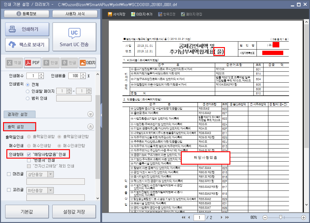 공제감면세액 합계표(을) 관련 공제세액감면이 없을 경우 해당사항이 없을 때 인쇄시 옵션 해당없음 check!!