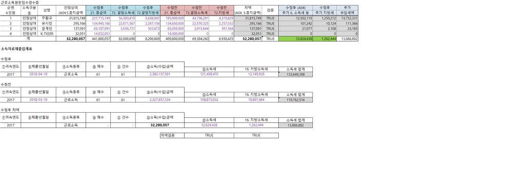 암튼 수정전 소득자료제출집계표 수정후 소득자료제출집계표, 인정상여당하시는 분의 수정전 근로소득원천징수영수증 수정후 근로소득원천징수영수증이 필요합니다.