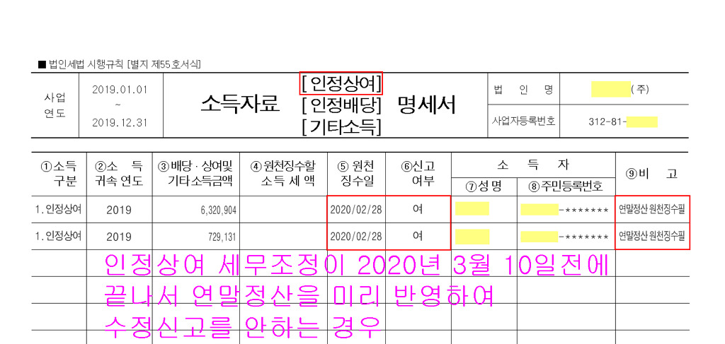 수정분(근로소득원천징수영수증에 15.인정상여 금액기재해서 재정산) 근로소득원천징수영수증(수정전 금액 주기로 윗라인에 표기)세무서 직접 제출 (※근로소득원천징수영수증 맨 위 빈칸에 <소득처분> 이라고 기재)
