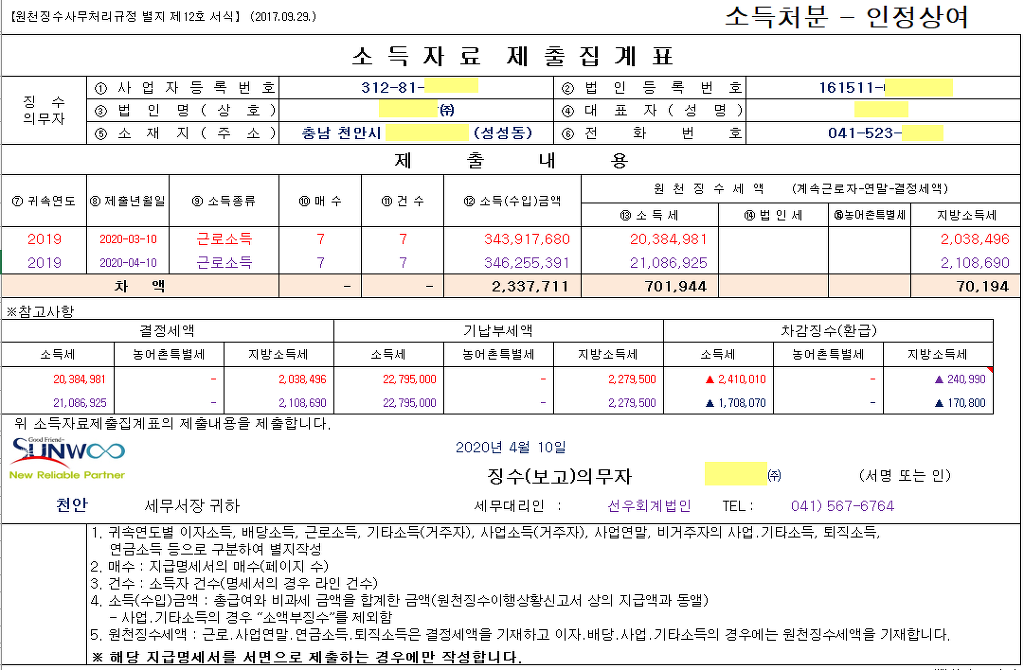소득자료제출집계표 - 수정 후 출력 후 수정전 금액을 금액위에 빨간색으로 기표