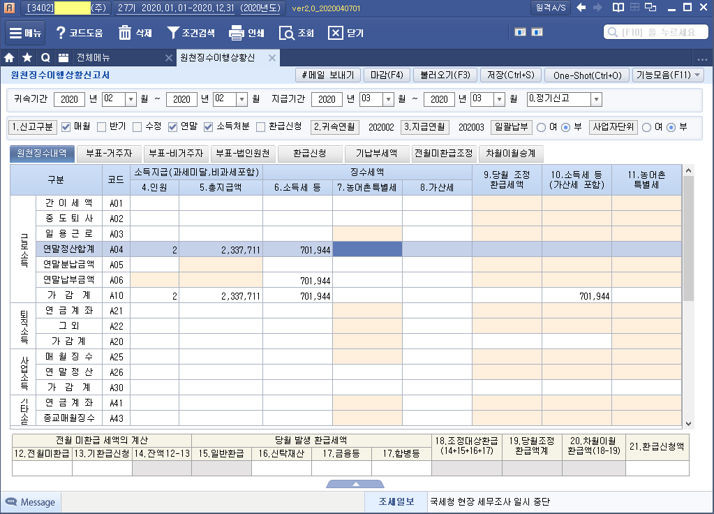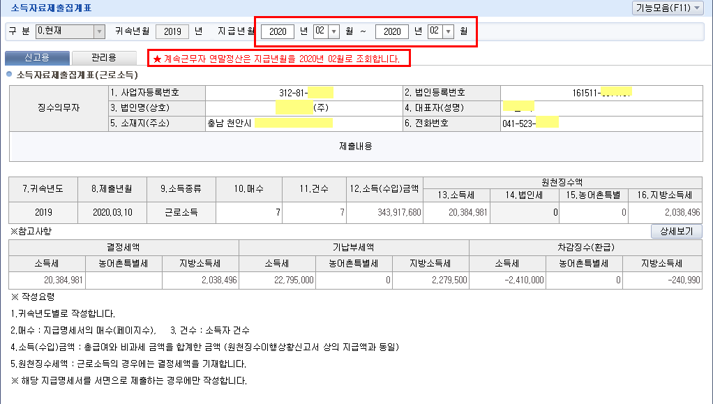 수정된 "소득자료집계표" 제출 ★ 계속근무자 2020년 02월로 조회하고 이전 수정전 윗 줄에 주기