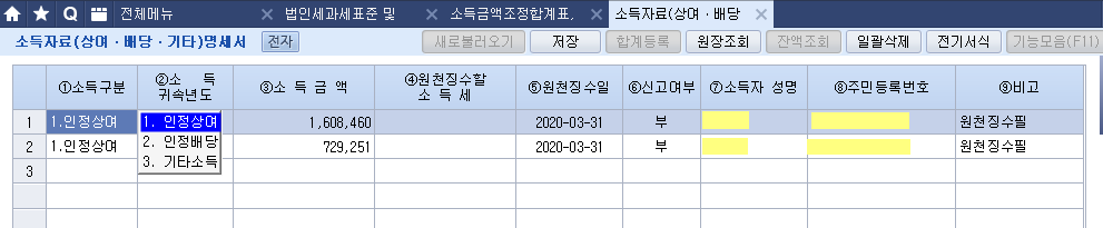 3. 근로소득원천징수영수증 마감을 풀고, 완료를 해제하고 , 각 인정상여 처분된 사람의 근로소득원천징수영수증에 인정상여금액을