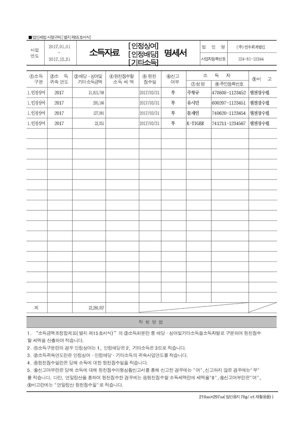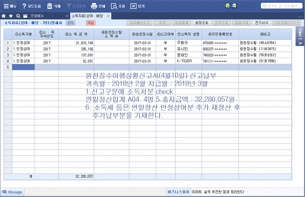 직접 기재한다.4. 인원은 소득자료명세서상 인정상여 4. 인원을 기재하고, 5.총지급액은 소득자료명세서상의 계 금액을 기재한다.