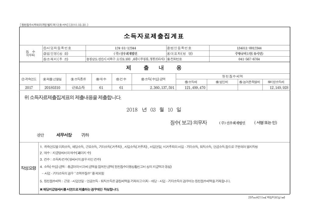 세무서 직접제출 : 근로소득원천징수영수증(수정분),소득자료제출집계표(수정분), 법인세세무조정계산서상의 소득자료(상여·배당·기타) 명세서 (편철은 소득자료제출집계표 - 근로소득원천징수영수증 - 소득자료명세서 순)