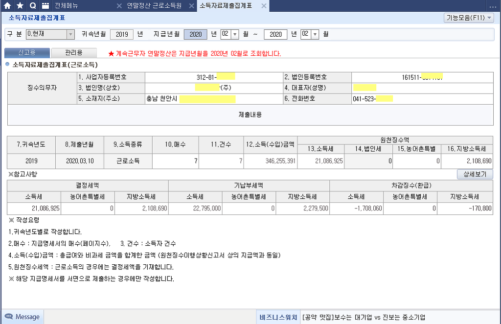 1. 2019년귀속 연말정산(2020년 02월로 조회) 소득자료제출집계표 (인정상여 반영한)