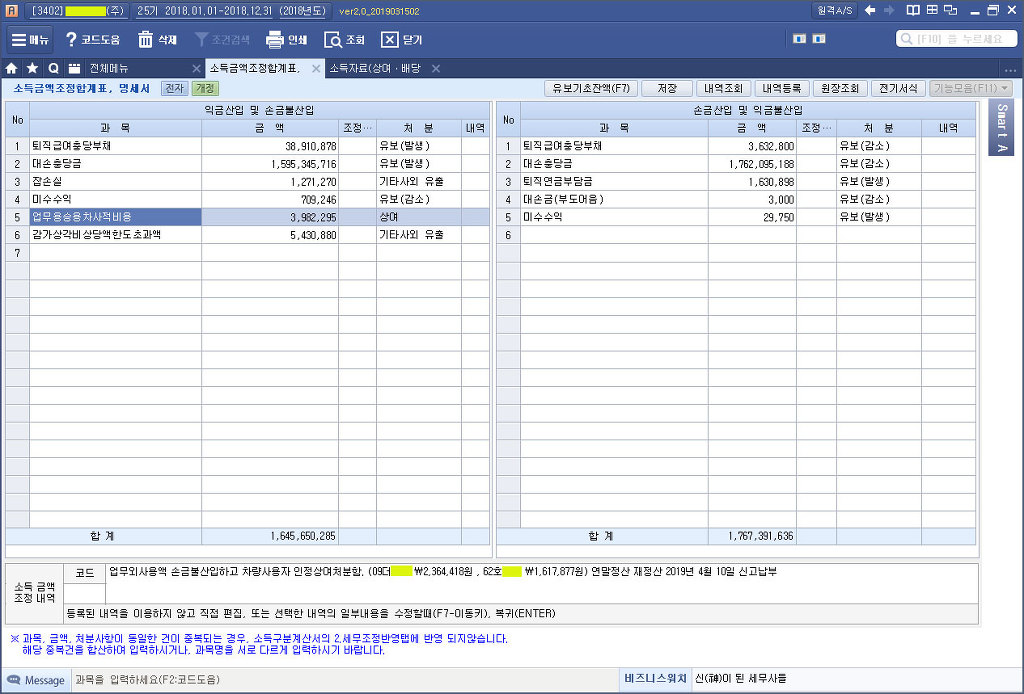 1. 2017년 귀속 세무조정계산서에서 소득자료명세서를 출력한다.