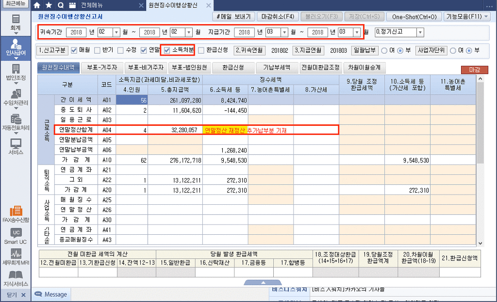 5. 2018년귀속 원천징수이행상황신고서에 2월귀속 3월 지급 을 입력하여 불러온 다음 소득처분에 체크하고, 연말정산란(A04)에