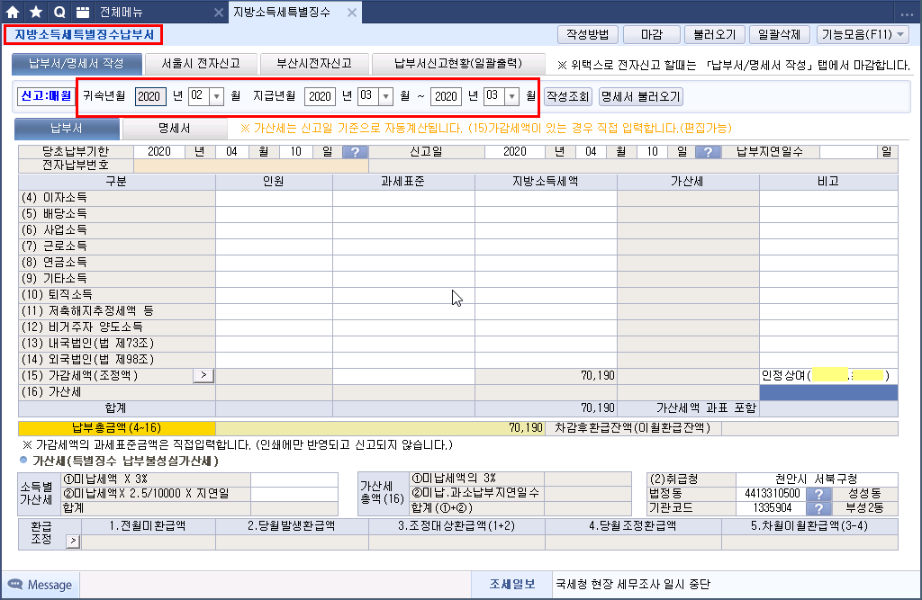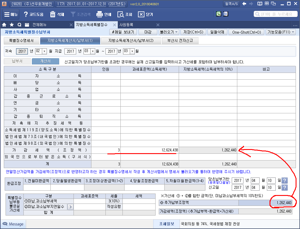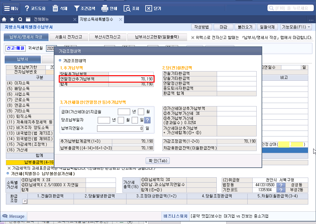 계산서 Tab 클릭 가감세액(조정액) 인원 기재 과세표준액(소득세액) 기재 하단 오른쪽 ⊙추가납부조정액에 인정상여에 대한 지방소득세 기재