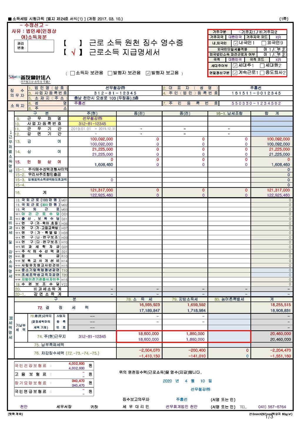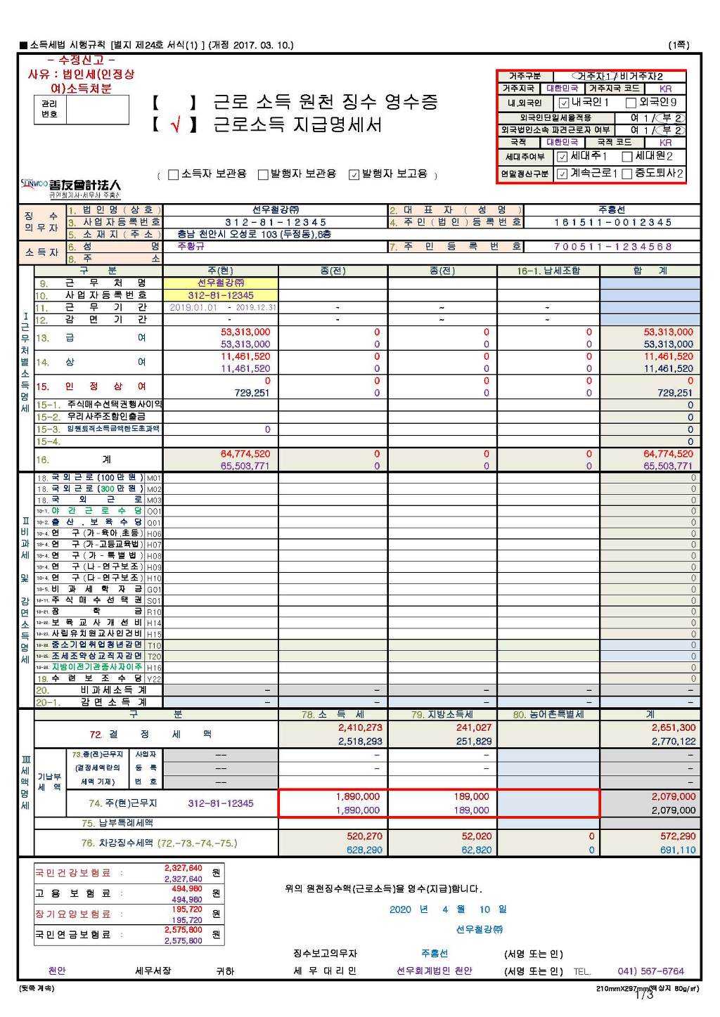 2. 인정상여 반영 한수정후 근로소득원천징수영수증