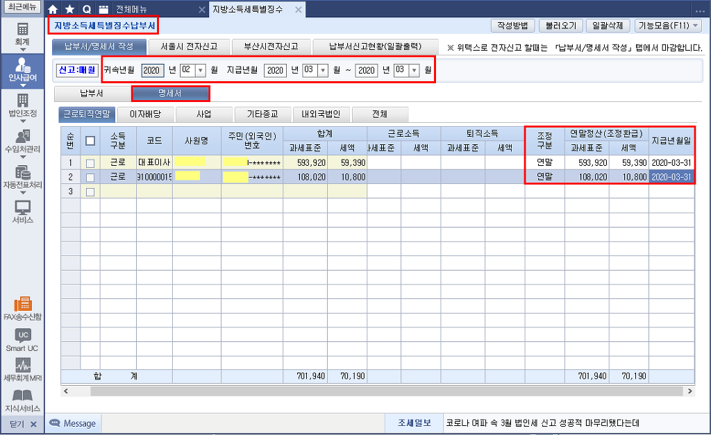 세무서 전자신고 : 원천징수이행상황신고서 (인정상여 반영 귀속월 2월 ~ 지급월 3월) 4월10일까지 신고 납부