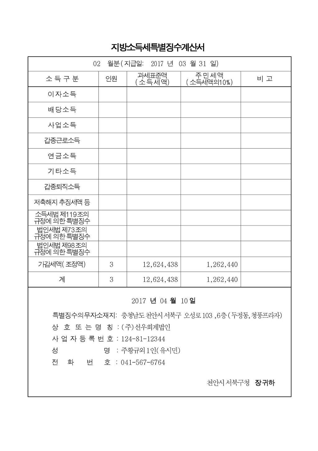 특별징수명세서 귀속년월 2018년 02월 지급년월 2018년 03월 ~ 2018년 03월
