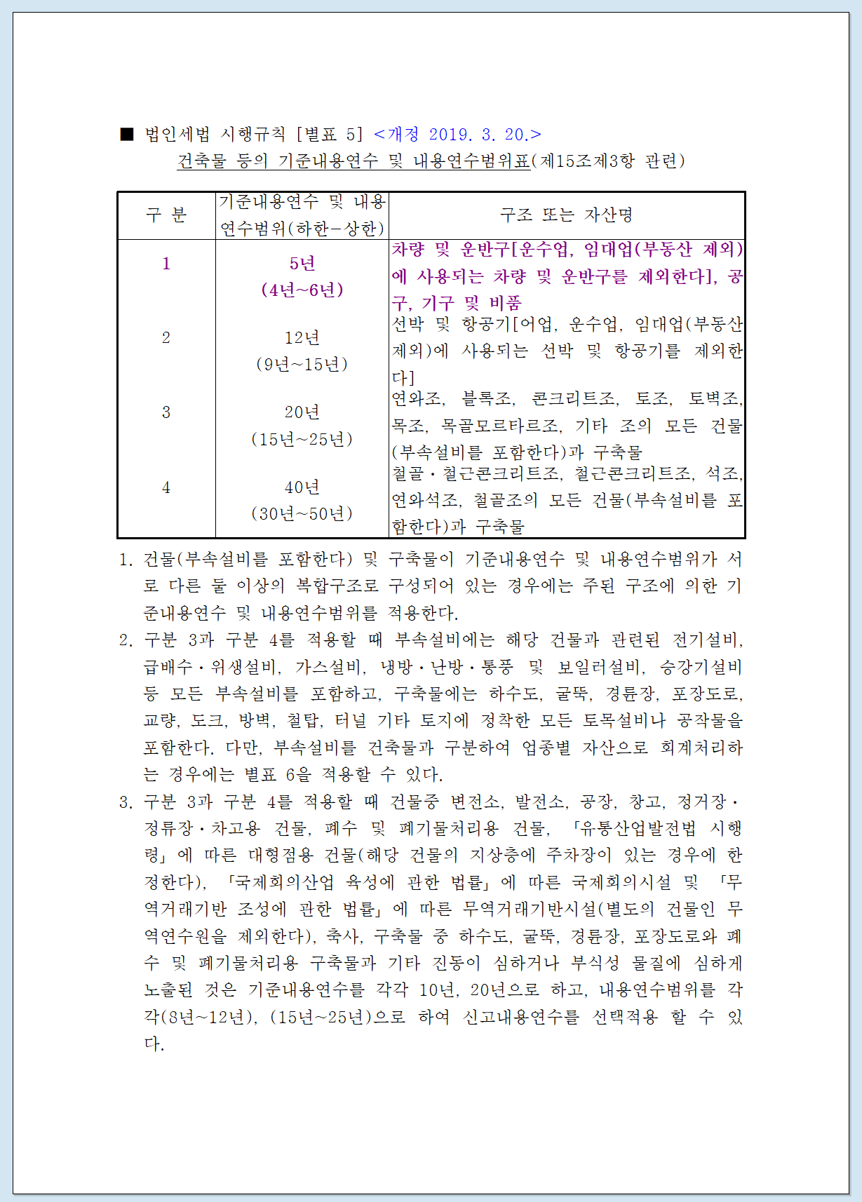 구분 1 │ 5년(4년∼6년) │차량 및 운반구(운수업, 기계장비 및 소비용품 임대업에 사용되는 차량 및 운반구를 제외한다), 공구, 기구 및 비품
