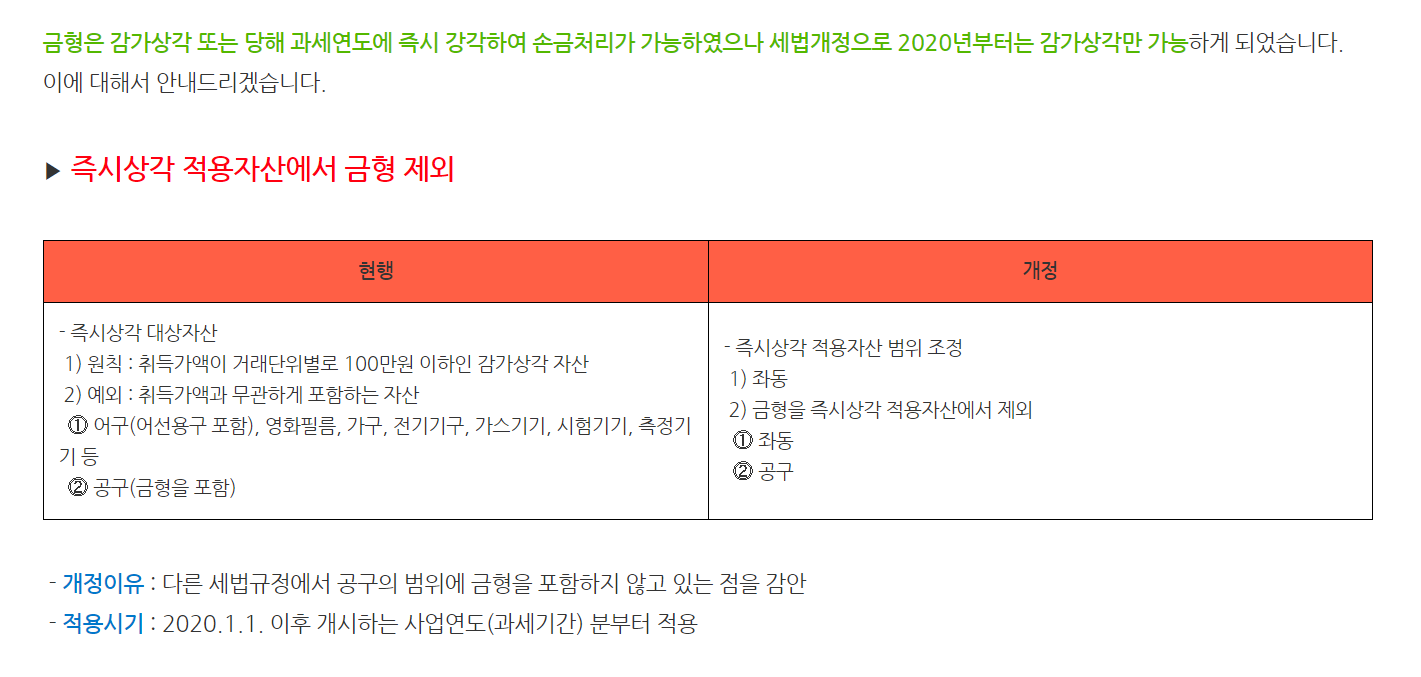 그러나 아래 2019년 세법 시행령 개정에 따라 20.1.1. 이후 취득하는 금형에 대해서는 세법 상 원칙적으로 즉시 비용처리를 인정하지 아니하고 유형자산으로 회계처리 후 감가상각을 통해 손금처리를 해야 합니다.