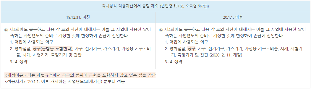 | <개정이유> 다른 세법규정에서 공구의 범위에 금형을 포함하지 않고 있는 점을 감안 <적용시기> 2020.1.1. 이후 개시하는 사업연도(과세기간)분부터 적용 | |