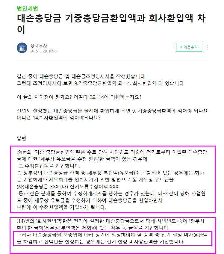 법인이 피합병법인의 자산과 부채를 장부가액으로 승계하는 방법으로 합병하고 승계받은 대출채권에 대해 대손충당금을 추가 적립할 수 있음.(서이 46012-11868, 2003.10.27 및 서이-1363, 2004.6.30)