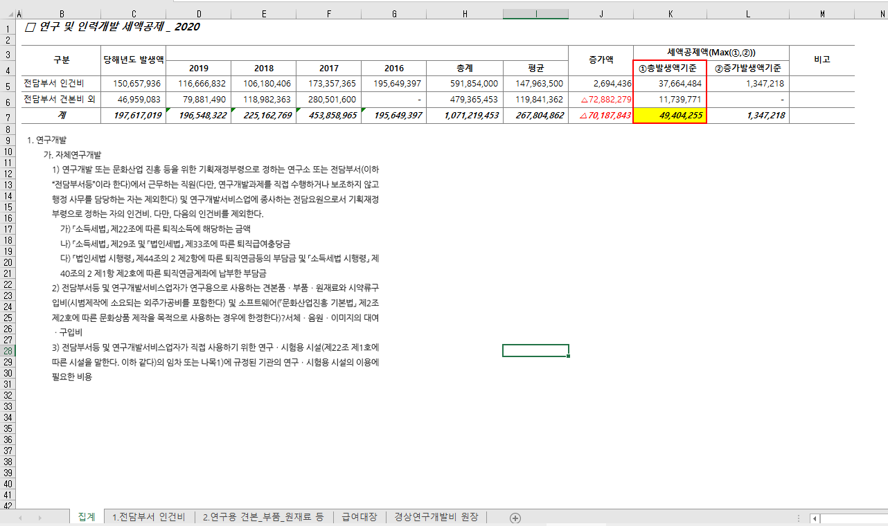 단 국민연금보험료 사용자부담금과 산재보험료 사용자부담금은 비과세 근로소득이 아니고 소득세 과세제외대상이므로 세액공제 대상 연구요원의 인건비에 해당하지 아니합니다.