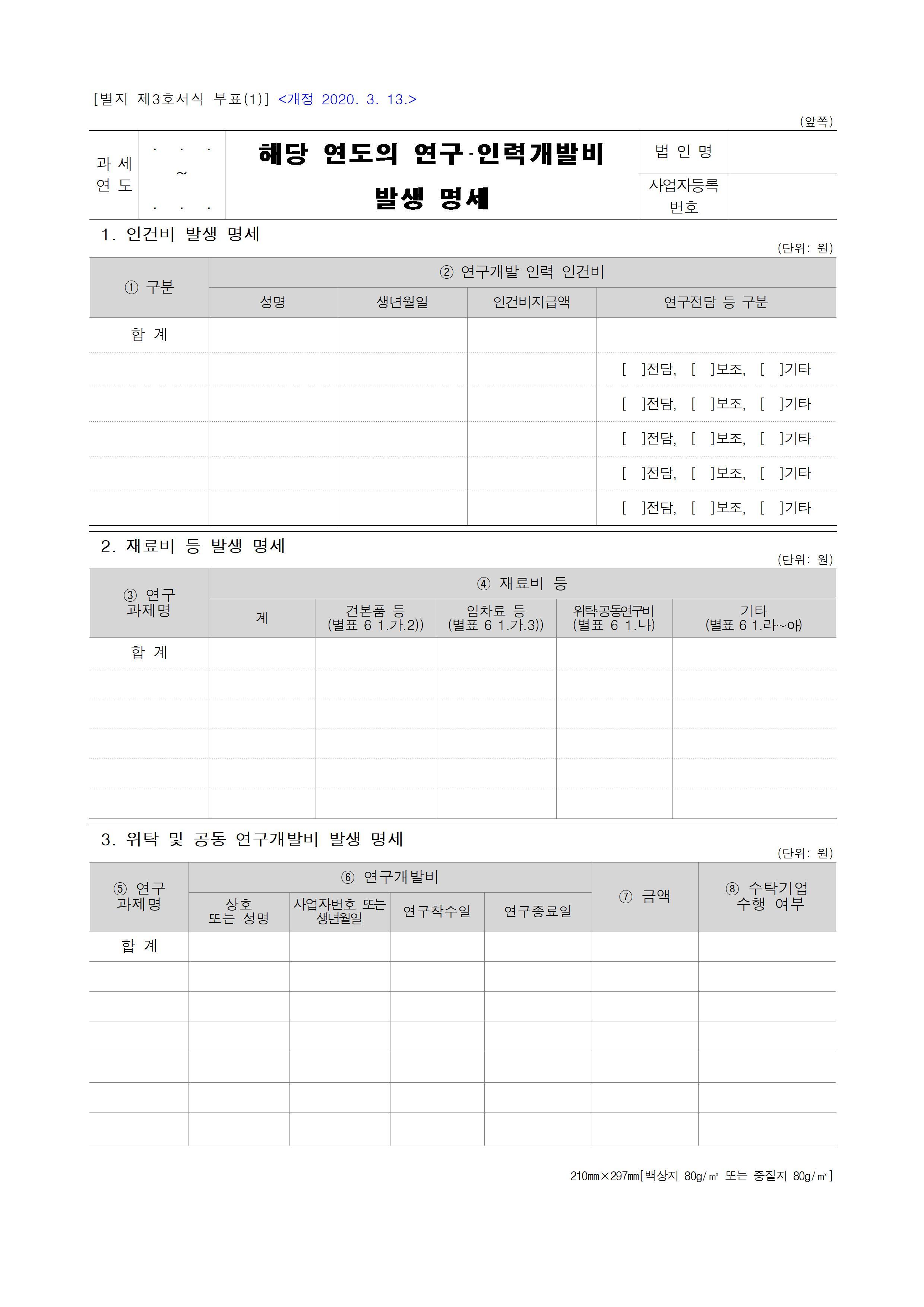 | 「산업재해보상보험법」제4조 규정에 따라 사용자로서 법인이 부담하는 산재보험료는 「조세특례제한법」 제10조에 따른 연구・인력개발비에 대한 세액공제 대상이 되는 인건비에 포함되지 않는 것입니다 | |