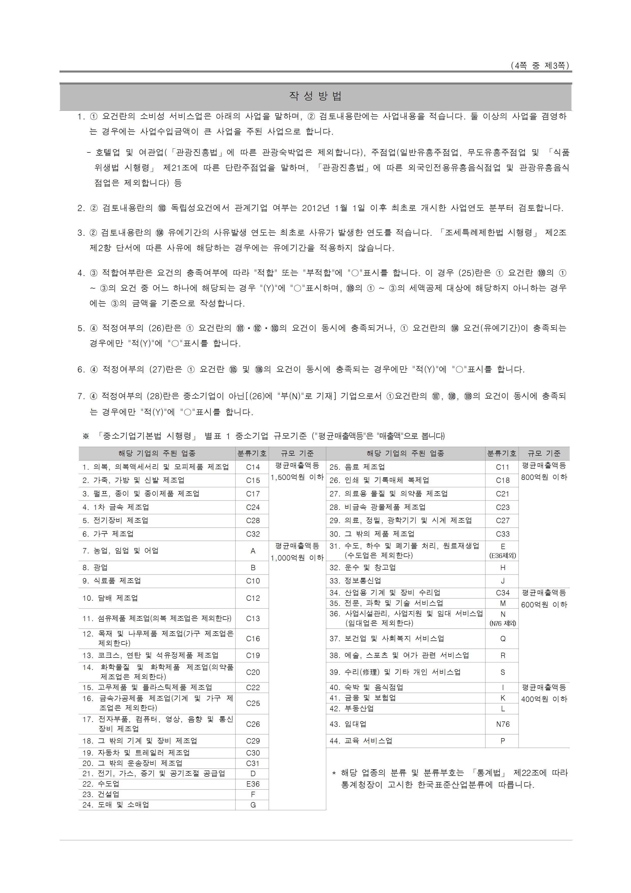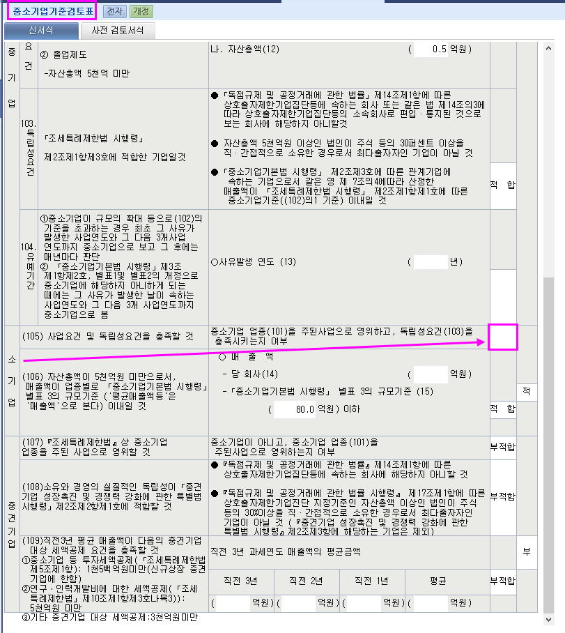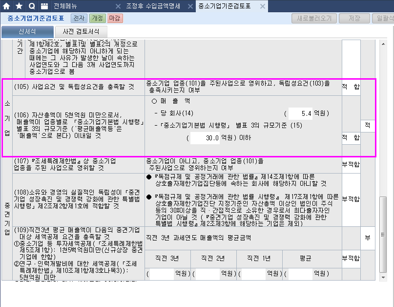 중소기업기준검토표에서 가장 매출이 큰 업종코드 넣으면 자동으로 불러옴