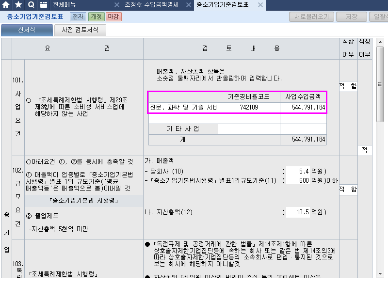 잉. 중소기업기준검토표에서 가장 매출이 큰 업종코드 넣으면 자동으로 불러옴
