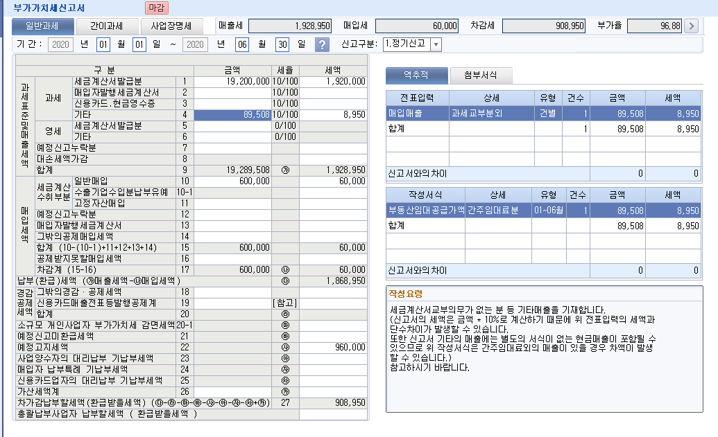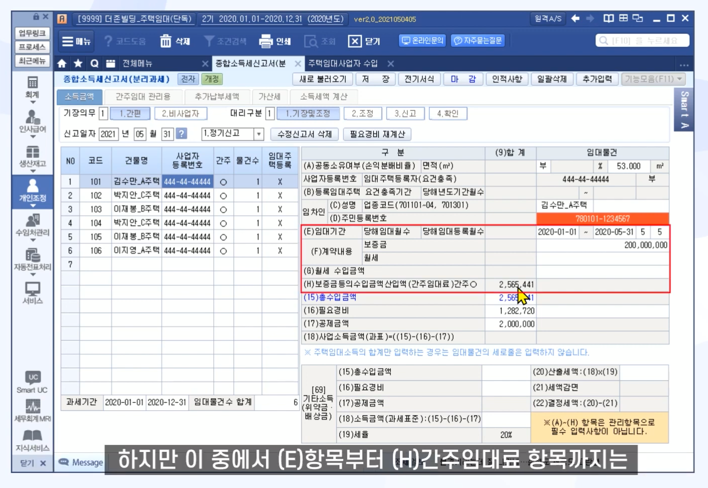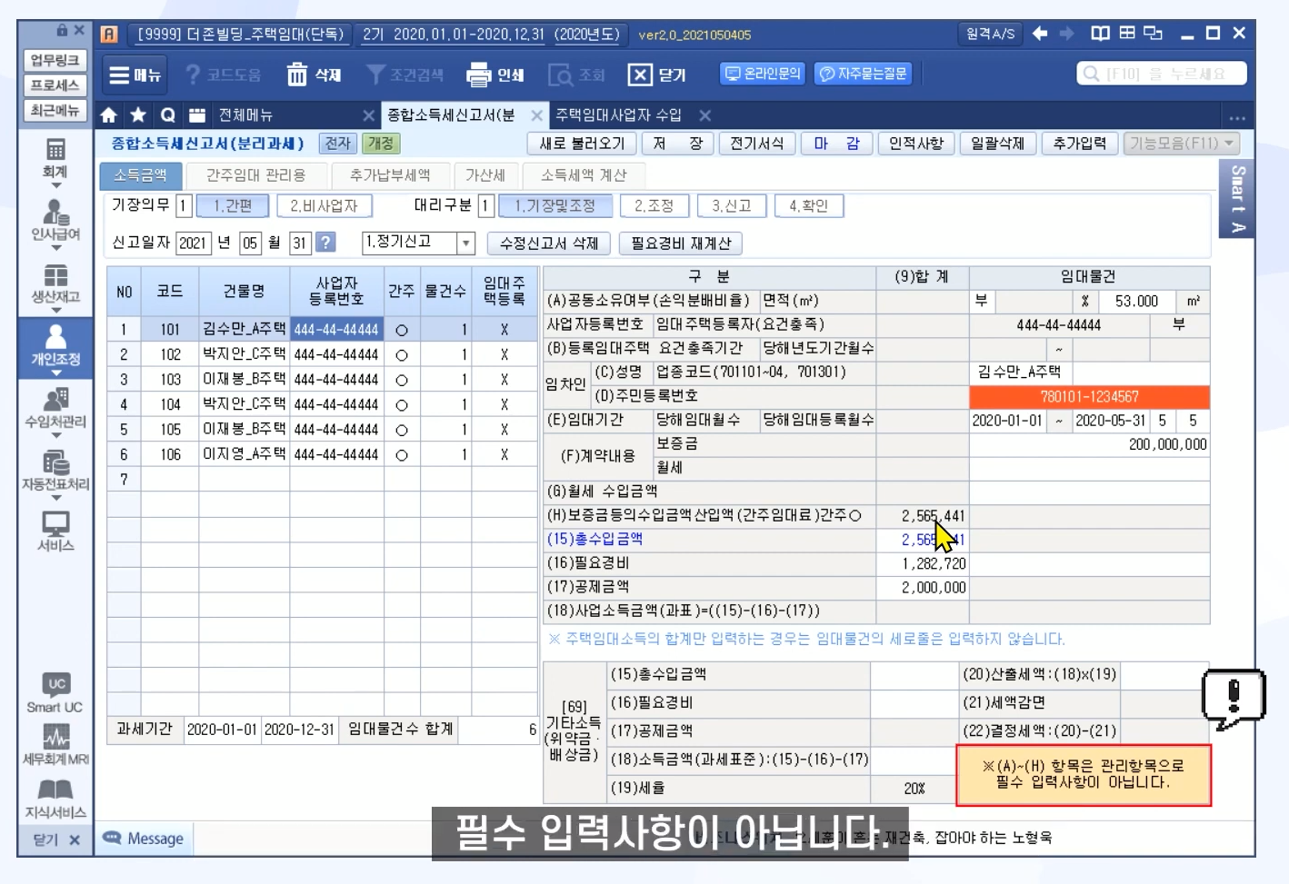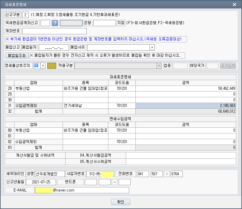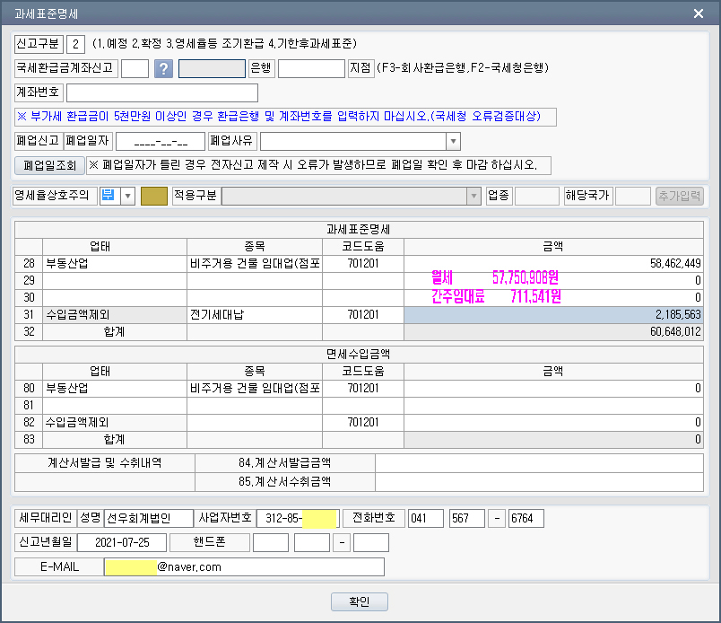 - 간주임대료는 부가세 신고시 과세표준에 포함되고, 종합소득세 결산시 수입금액에도 포함됩니다. 그러므로 과세표준 명세서 수입금액에서 제외시키면 안됩니다.