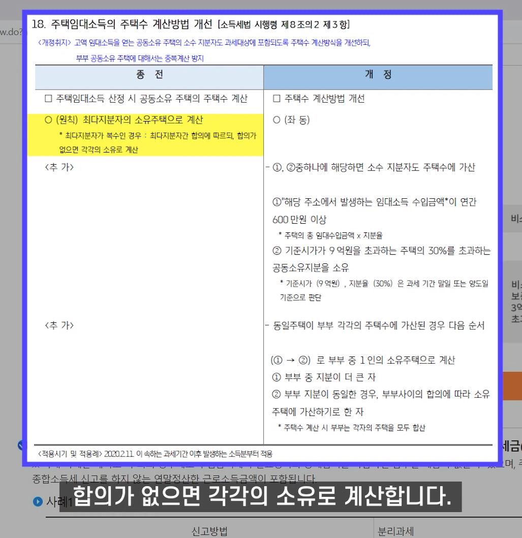 다만, 주택을 대여하고 보증금등을 받은 경우에는 3주택[주거의 용도로만 쓰이는 면적이 1호(戶) 또는 1세대당 40제곱미터 이하인 주택으로서 해당 과세기간의 기준시가가 2억원 이하인 주택은 2021년 12월 31일까지는 주택 수에 포함하지 아니한다] 이상을 소유하고 해당 주택의 보증금등의 합계액이 3억원을 초과하는 경우를 말하며, 주택 수의 계산 그밖에 필요한 사항은 대통령령으로 정한다. <개정 2012. 1. 1., 2014. 1. 1., 2016. 12. 20., 2018. 12. 31.>