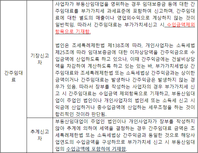 부가세는 간주임대료 포함 소득세는 간편장부 복식장부이면 수입금액제외로 시작해서 간주익금계산 조정하여 익금액이 나오면 추가액만큼만 산입