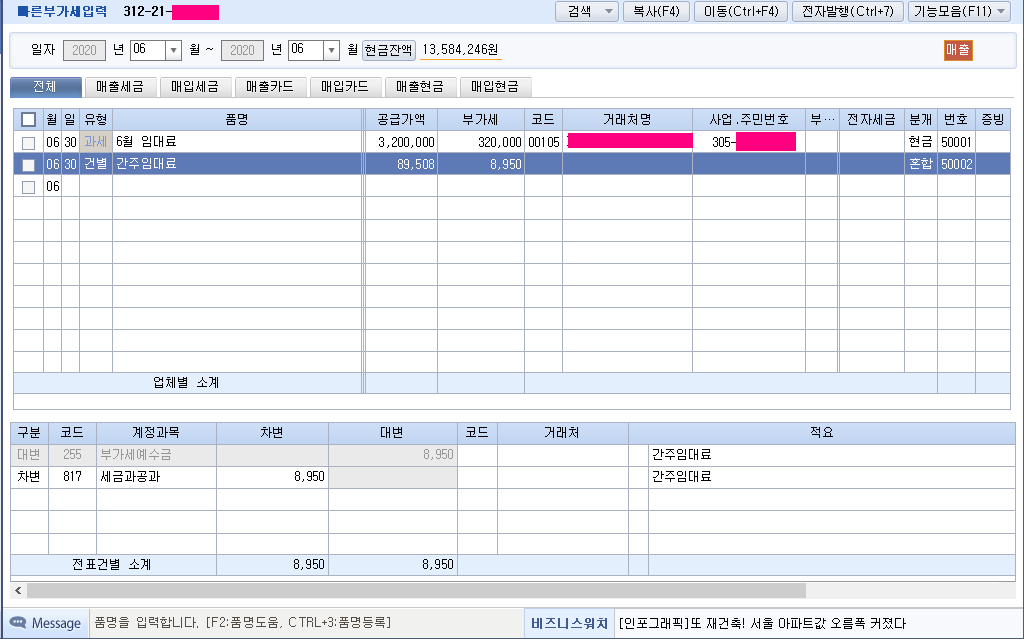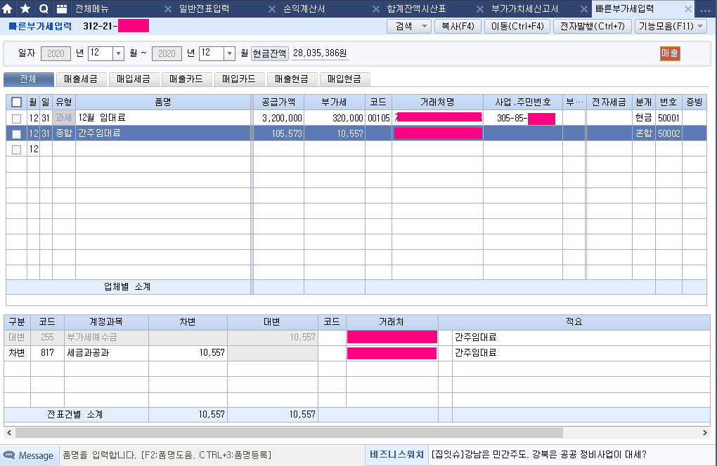 종합 차) 세금과공과 xxx / 대) 부가세예수금 xxx