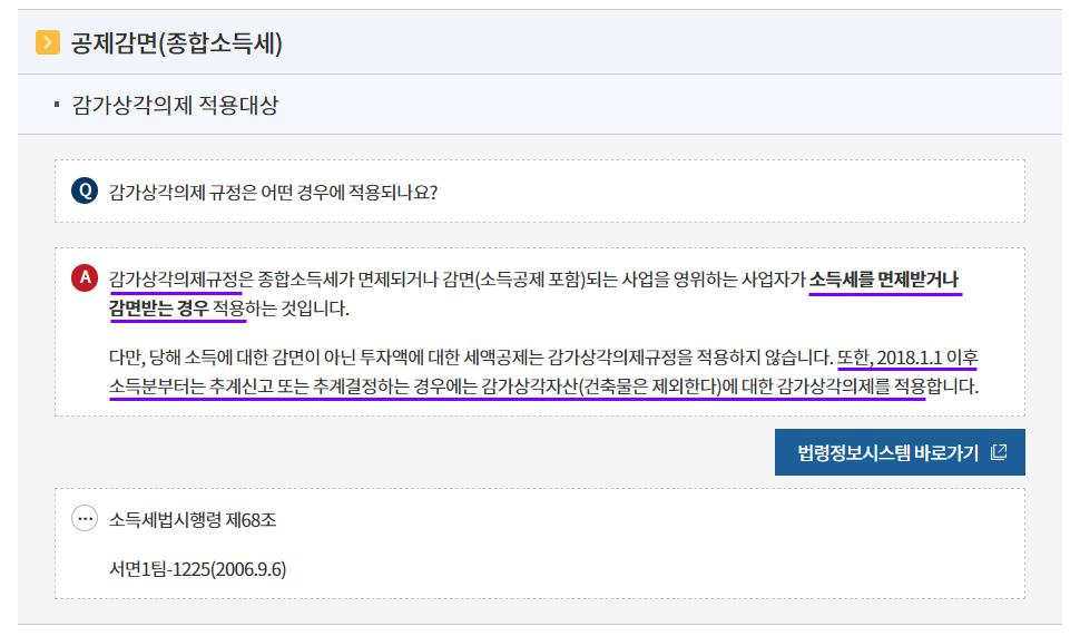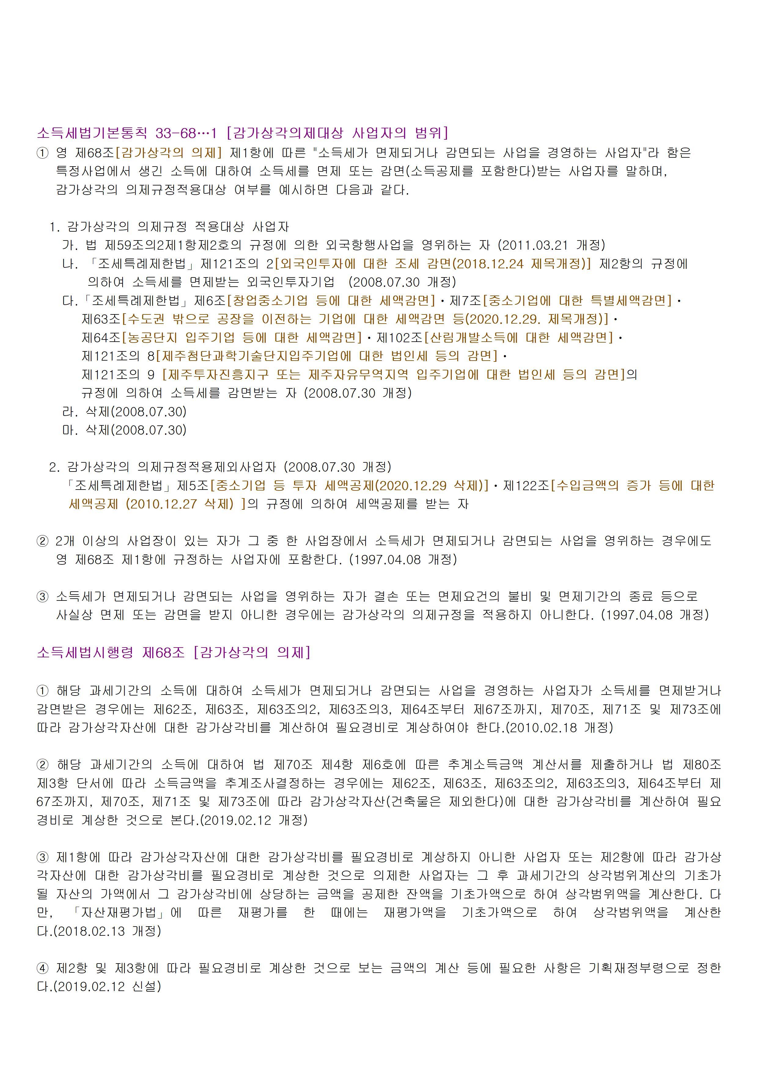 ① 영 제68조 [ 감가상각의 의제 ] 제1항에 따른 "소득세가 면제되거나 감면되는 사업을 경영하는 사업자"라 함은 특정사업에서 생긴 소득에 대하여 소득세를 면제 또는 감면(소득공제를 포함한다)받는 사업자를 말하며,