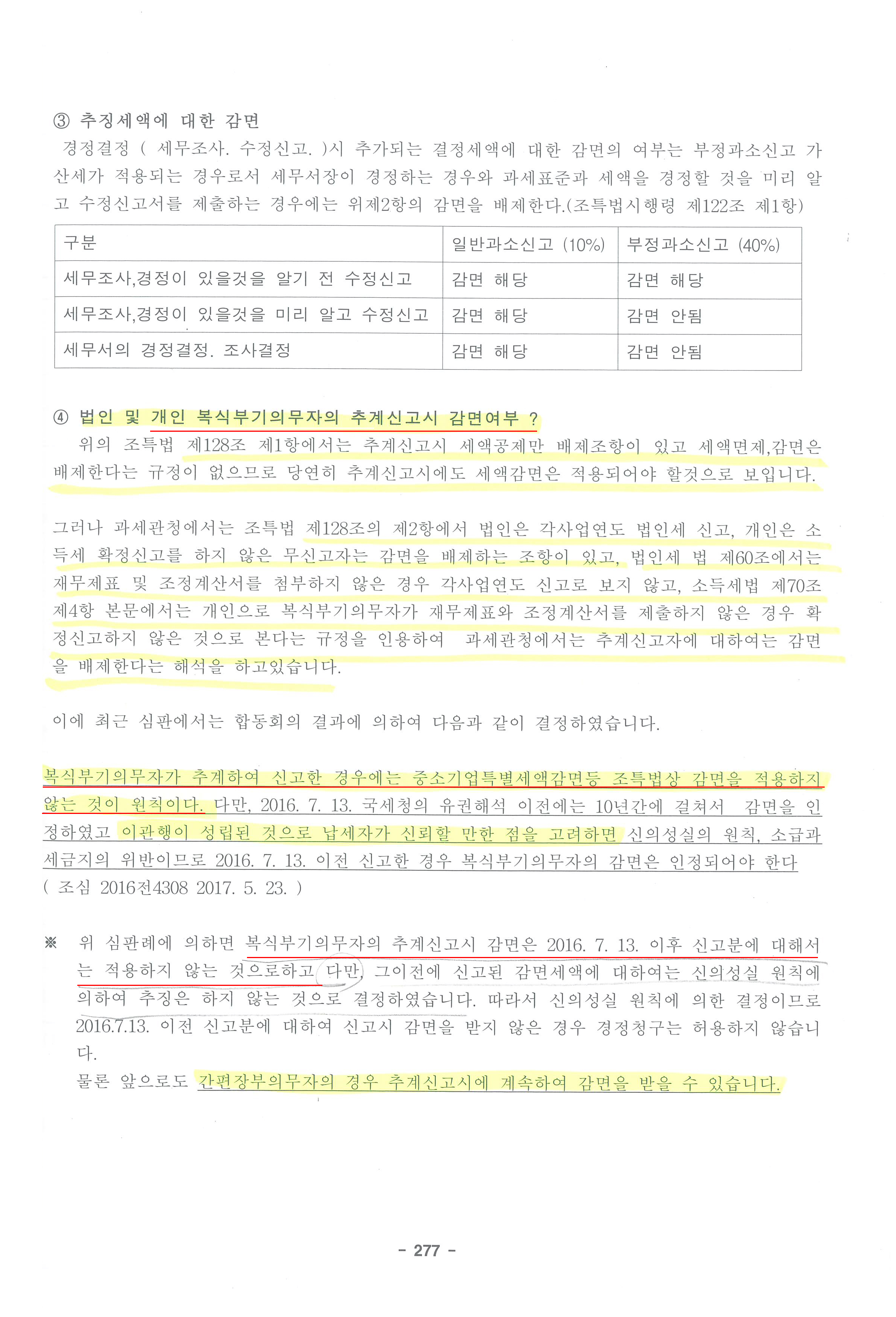 | 안녕하십니까? 항상 국세행정에 대한 관심과 협조에 감사드립니다. 조세특례제한법 제29조의 7 [고용을 증대시킨 기업에 대한 세액공제] 는 추계시 적용배제될 것으로 판단됩니다. [관련법령] *조세특례제한법 제128조 【추계과세 시 등의 감면배제】 ① 「소득세법」 제80조[ 결정과 경정 ]제3항 단서 또는 「법인세법」 제66조[ 결정 및 경정 ]제3항 단서에 따라 추계(推計)를 하는 경우에는 제7조의2[ 기업의 어음제도개선을 위한 세액공제 ], 제7조의4[ 상생결제 지급금액에 대한 세액공제(2015.12.15 신설) ], 제8조의3제3항[ 상생협력을 위한 기금 출연 등에 대한 세액공제(2018.12.24 제목개정) ], 제10조[ 연구·인력개발비에 대한 세액공제(2008.12.26 제목개정) ], 제12조[ 기술이전 및 기술취득 등에 대한 과세특례(2014.01.01 제목개정) ]제2항, 제12조의3[ 기술혁신형 합병에 대한 세액공제(2014.01.01 신설) ], 제12조의4[ 기술혁신형 주식취득에 대한 세액공제(2014.01.01 신설) ], 제13조의2[ 내국법인의 벤처기업 등에의 출자에 대한 과세특례(2016.12.20 신설) ], 제13조의3[ 내국법인의 소재·부품·장비전문기업에의 출자·인수에 대한 과세특례, 제19조 [ 성과공유 중소기업의 경영성과급에 대한 세액공제 등(2018.12.24 신설) ]제1항, 제24조[ 통합투자세액공제(2020.12.29 신설) ], 제25조의6[ 영상콘텐츠 제작비용에 대한 세액공제(2016.12.20 신설) ], 제26조[ 고용창출투자세액공제(2010.12.27 제목개정) ], 제29조의2부터 제29조의5[ 청년고용을 증대시킨 기업에 대한 세액공제 ]까지, 조세특례제한법 제29조의 3 [ 경력단절 여성 고용 기업 등에 대한 세액공제(2019.12.31 제목개정) ] 조세특례제한법 제29조의 4 [ 근로소득을 증대시킨 기업에 대한 세액공제(2014.12.23 신설) ] 제29조의7[ 고용을 증대시킨 기업에 대한 세액공제(2017.12.19 신설) ], 제30조의2 [ 정규직 근로자로의 전환에 따른 세액공제(2008.09.26 제목개정) ]부터 제30조의4 [ 중소기업 사회보험료 세액공제(2017.12.19 제목개정) ]까지, 조세특례제한법 제30조의 3 [ 고용유지중소기업 등에 대한 과세특례(2009.05.21 제목개정) ] 제96조의3[ 상가임대료를 인하한 임대사업자에 대한 세액공제(2020.03.23 신설) ] (「소득세법」 제160조[ 장부의 비치ㆍ기록(2009.12.31 제목개정) ]에 따른 간편장부대상자는 제외한다), 제99조의12[ 선결제 금액에 대한 세액공제(2020.05.19 신설) ], 제104조의14[ 제3자물류비용에 대한 세액공제(2007.12.31 신설) ], 제104조의15[ 해외자원개발투자에 대한 과세특례(2007.12.31 신설) ], 제104조의25 [ 석유제품 전자상거래에 대한 세액공제 (2011.12.31 신설) ], 제104조의30[ 우수 선화주기업 인증을 받은 화주 기업에 대한 세액공제(2019.12.31 신설) ], 제122조의4 [ 금사업자와 스크랩등사업자의 수입금액의 증가 등에 대한 세액공제(2015.12.15 제목개정) ]제1항 및 제126조의7[ 금 현물시장에서 거래되는 금지금에 대한 과세특례(2014.01.01 신설) ]제8항을 적용하지 아니한다. 다만, 추계를 하는 경우에도 거주자에 대해서는 제24조[ 통합투자세액공제(2020.12.29 신설) ] 및 제26조[ 고용창출투자세액공제(2010.12.27 제목개정) ]를 적용(투자에 관한 증거서류를 제출하는 경우로 한정한다)한다. <개정 2010.3.12, 2011.12.31, 2013.1.1, 2014.1.1, 2014.12.23, 2015.12.15, 2016.12.20, 2017.12.19, 2018.12.24, 2019.12.31, 2020.3.23, 2020.5.19, 2020.12.29> 답변내용이 도움이 되셨길 바라며, 항상 건강하시고, 늘 행복이 가득하시기를 기원합니다. | ||