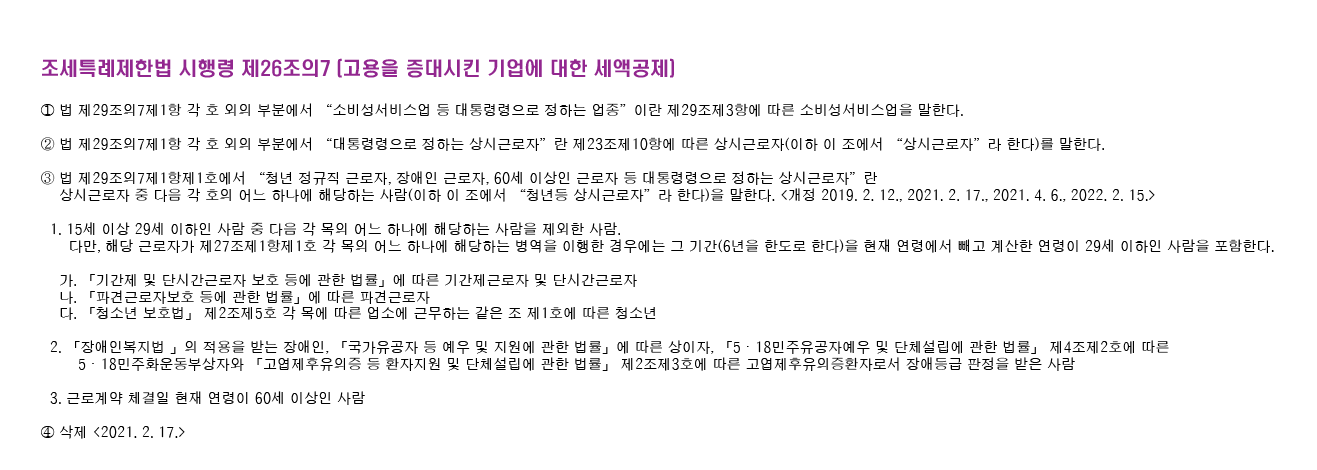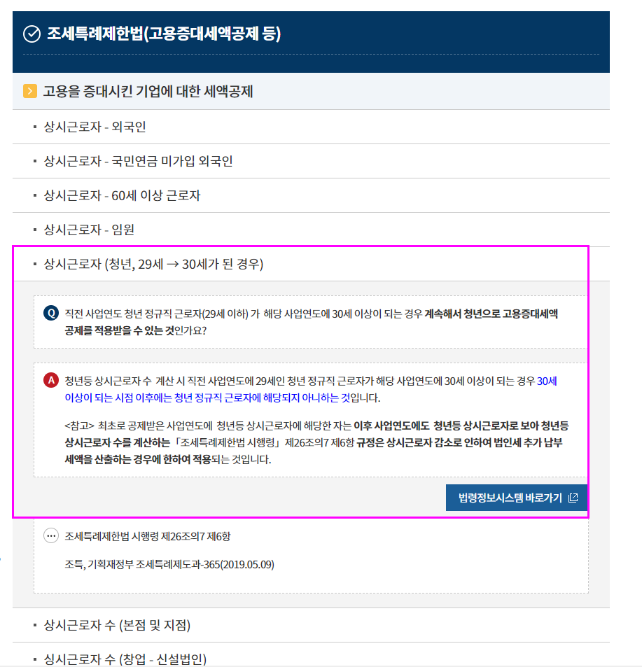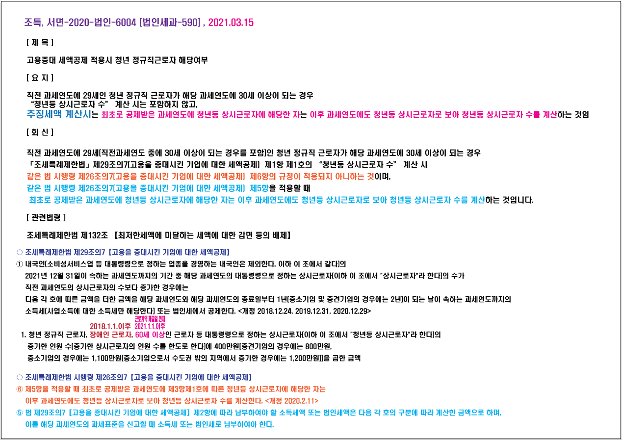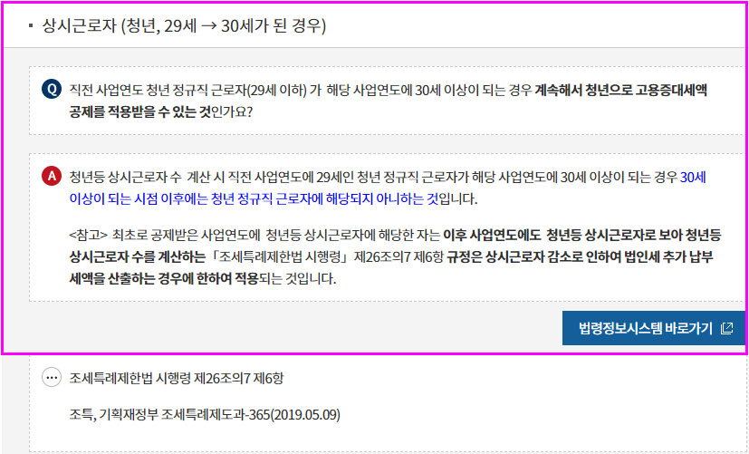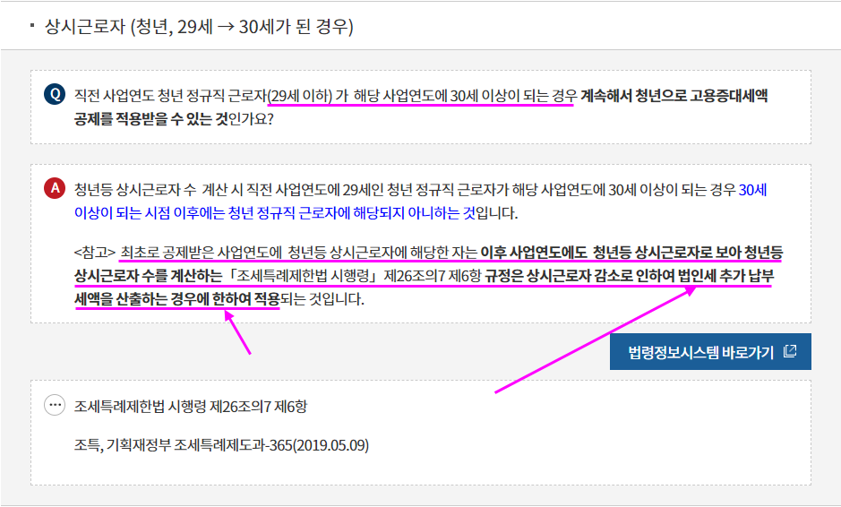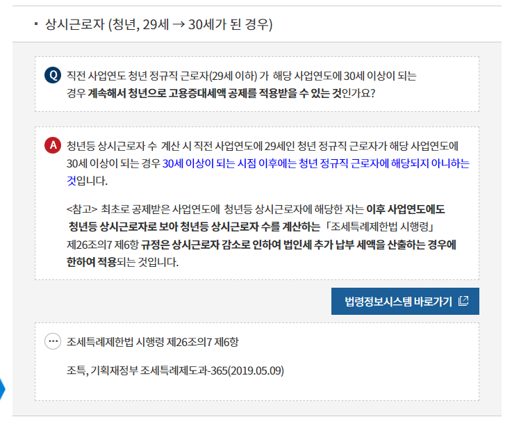- 직전 과세연도에 29세(직전 과세연도 중에 30세 이상이 되는 경우를 포함)인 청년 정규직 근로자가 해당 과세연도에 30세 이상이 되는 경우 조세특례제한법 제29조의 7 제1항 제1호의 “청년등 상시근로자 수” 계산 시 같은 법 시행령 제26조의 7 제6항의 규정이 적용되지 아니하는 것이며,